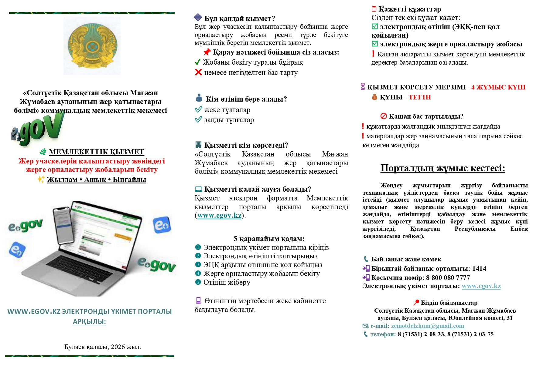 «Солтүстік Қазақстан облысы Мағжан Жұмабаев ауданының жер қатынастары бөлімі» коммуналдық мемлекеттік мекемесі «Жер учаскелерін қалыптастыру жөніндегі жерге орналастыру жобаларын бекіту» мемлекеттік қызметін көрсету туралы брошюра әзірледі.