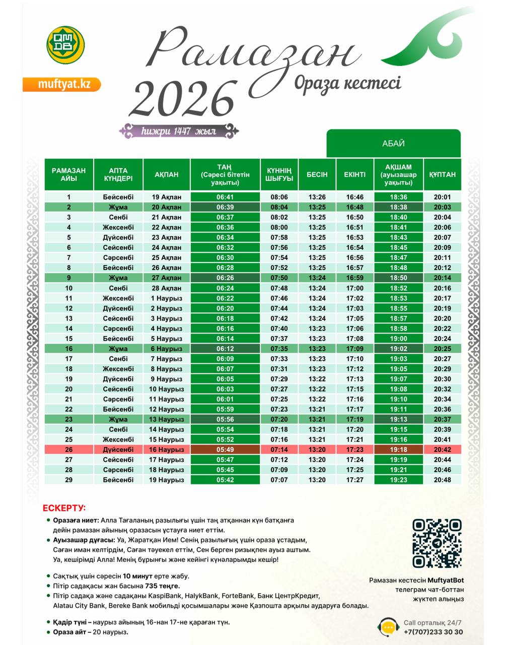 Осыған орай, Хромтау қаласы және ауылдық округтердегі тұрғындар үшін ауыз бекіту және ауыз ашу уақыттарының кестесін назарларыңызға ұсынамыз.