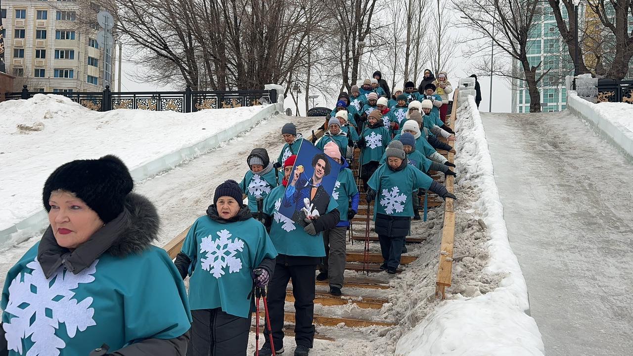 Қатысушылар қар үстіне қар ұшқынының бейнесін салып, қала тұрғындарына көтеріңкі көңіл күй сыйлады.