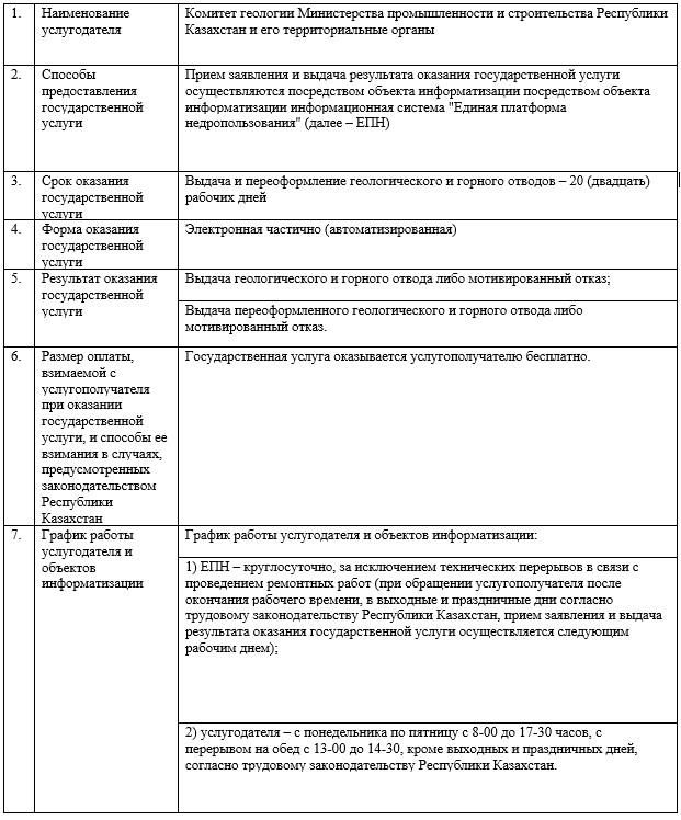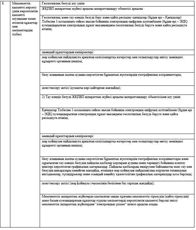 «Геологиялық және тау-кендік бөлуді беру және қайта рәсімдеу» мемлекеттік қызметін көрсетуге қойылатын негізгі талаптардың тізбесі