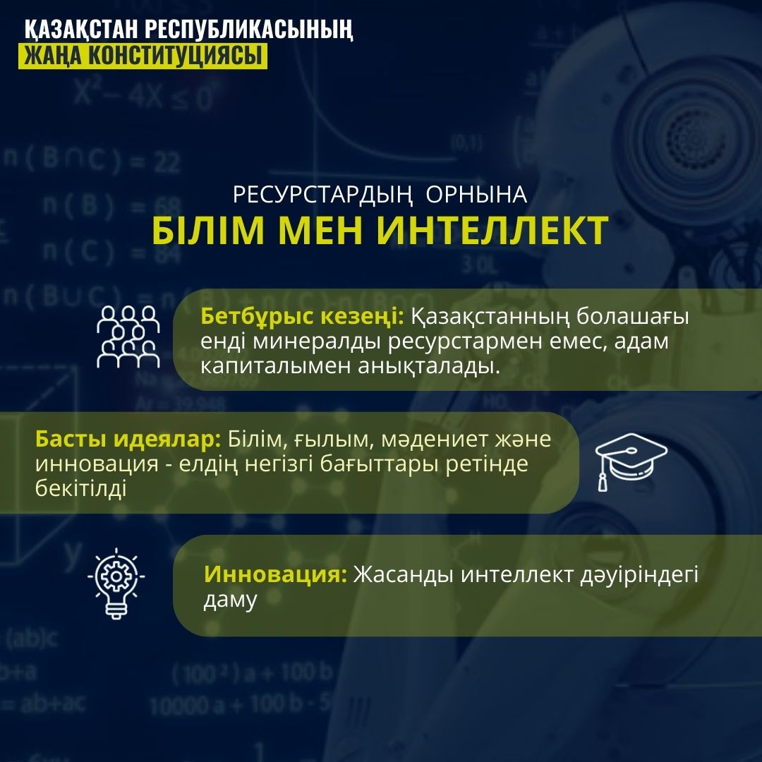 Қазақстан Республикасының жаңа Конституциясында ел дамуының жаңа бағыты ретінде білім мен интеллектке басымдық беру айқын көрсетілді. Бұл өзгеріс мемлекеттің дамуындағы маңызды бетбұрыс кезеңін білдіреді. Ендігі кезеңде Қазақстанның болашағы тек минералды ресурстармен ғана емес, ең алдымен адам капиталымен айқындалатыны атап өтілді.