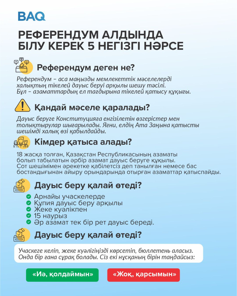 2026 жылғы 15 наурызда Қазақстанда жаңа Конституция жобасына дауыс беру үшін республикалық референдум өтеді. Ел азаматтары өз таңдауларын жасай отырып, елдің құқықтық және саяси дамуына тікелей ықпал ету мүмкіндігіне ие болады
