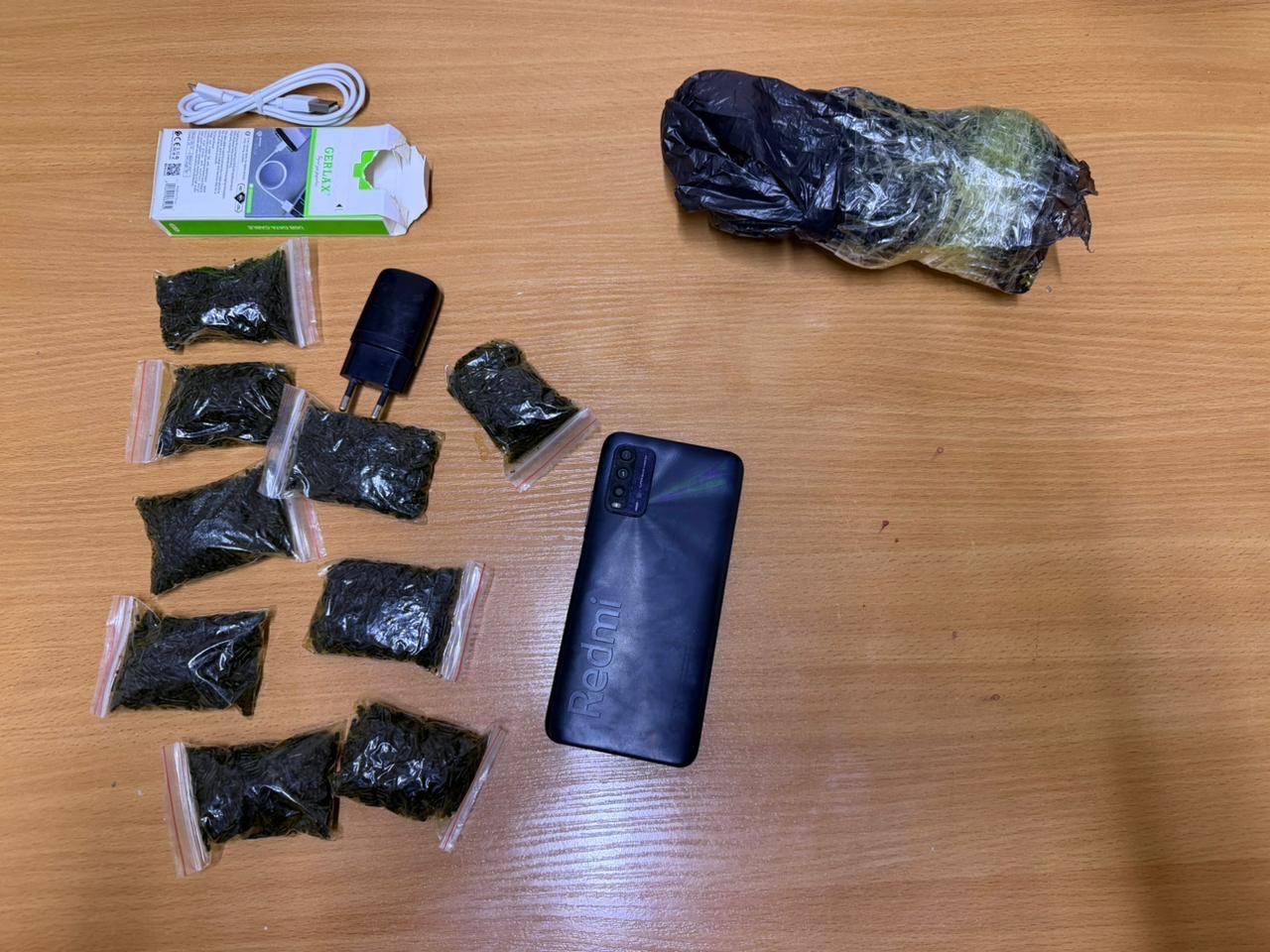 Тексеру кезінде желім таспамен оралған орамнан келесі заттар табылды: Redmi мобильді телефоны, зарядтау құрылғысы, 9 қорап насвай.