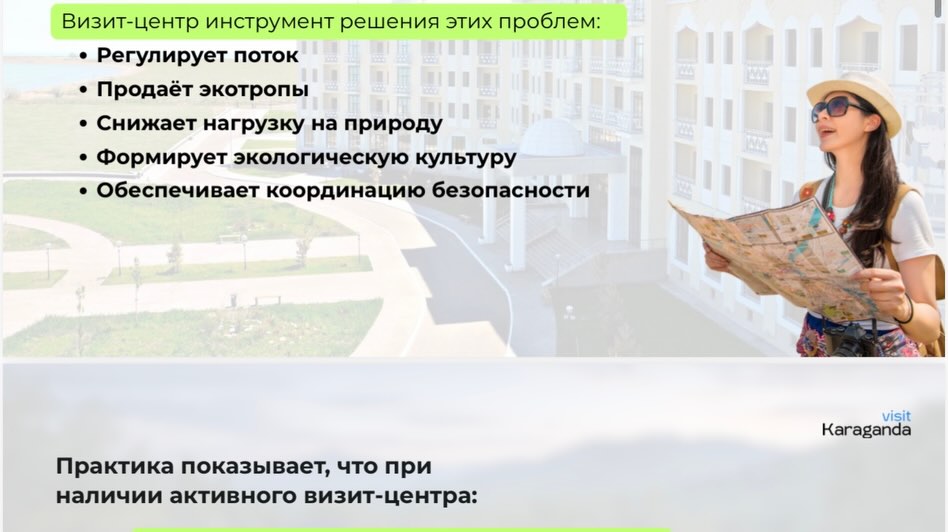 Визит-орталықтарды құру облыс қонақтары мен тұрғындарын туристік маршруттар, орналастыру нысандары, мәдени іс-шаралар және көрікті жерлер туралы өзекті ақпаратпен қамтамасыз етуге мүмкіндік береді.
