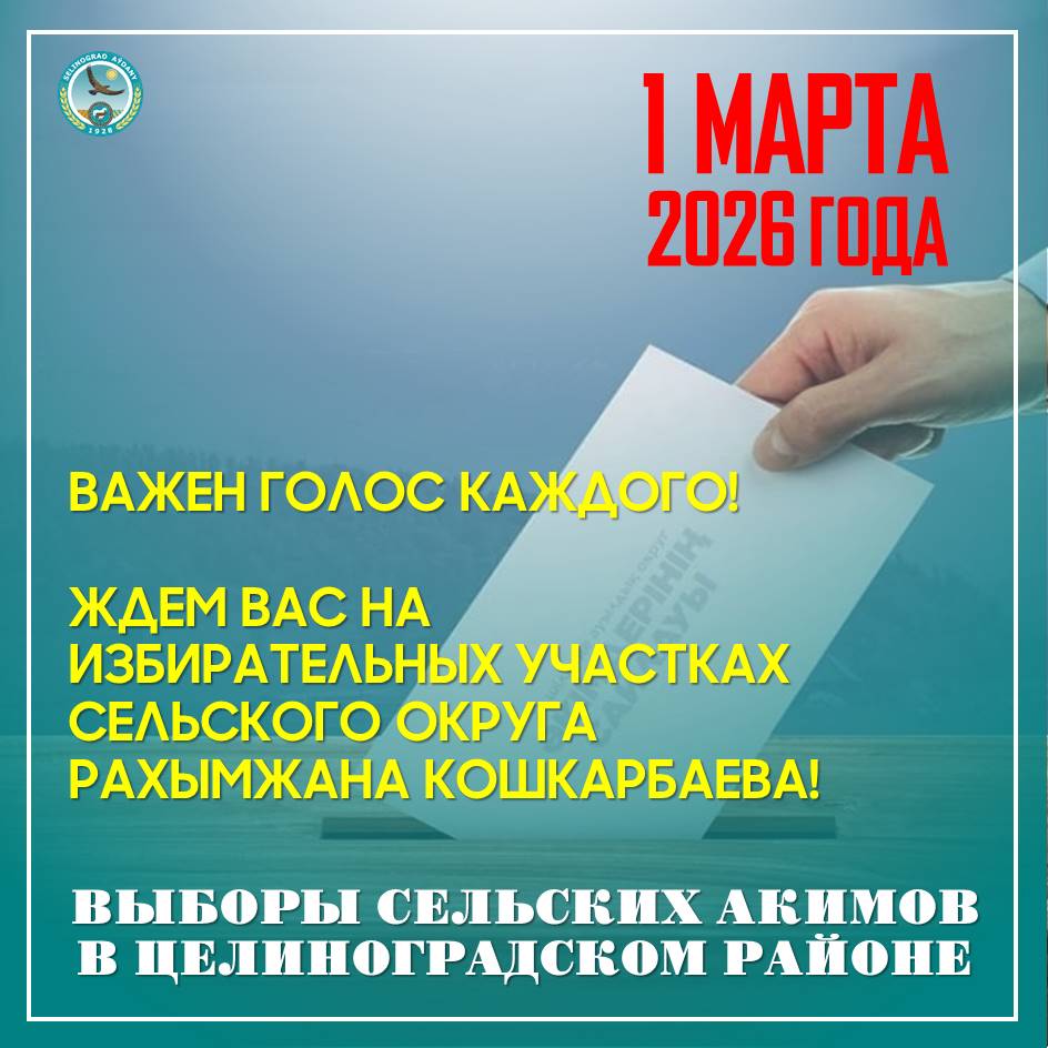 Учаскелік сайлау комиссиялары Сізді 2026 жылғы 1 наурызда таңғы сағат 07.00-ден кешкі 20.00-ге дейін болатын Целиноград ауданы Рахымжан Қошқарбаев ауылдық округі әкімінің сайлауында дауыс беруге қатысуға шақырады.
