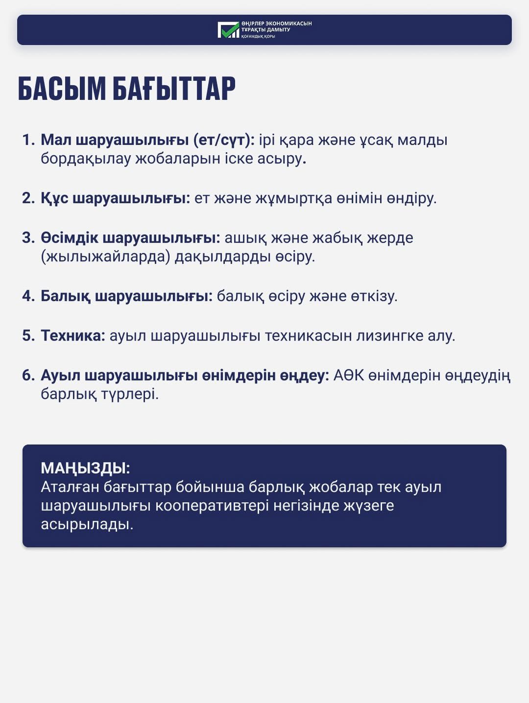 Ауыл аманаты бағдарламасы арқылы жылдық 2,5% мөлшерлемемен жеңілдетілген несие алыңыз. Мал шаруашылығы, құс өсіру, жылыжай, балық шаруашылығы, техника алу немесе ауыл шаруашылығы өнімдерін қайта өңдеу бағыттары бойынша жобалар қаржыландырылады.