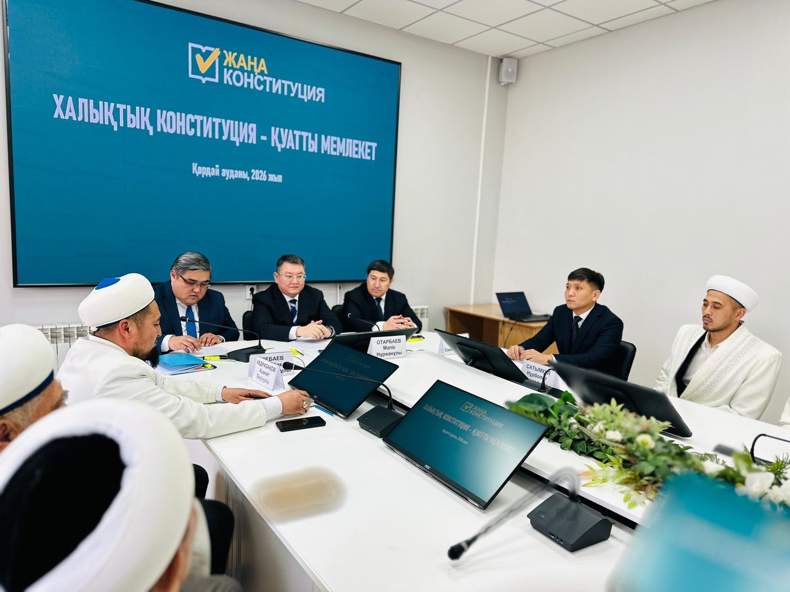 Шара Қордай ауданының мемлекеттік архивінің мәжіліс залында жалғасты. Мұнда ҚР Президентінің кеңесшісі аудандық мешіт имамдарымен кездесіп, референдумның мән-маңызы жөнінде пікір алмасты. Алғашқы сөз Қордай ауданының бас имамы Азамат Берікұлына берілді. Бас имам өз сөзінде ел бірлігі мен тұрақтылығының маңызын атап өтіп, қоғамдағы татулықты сақтауда рухани құндылықтардың орны ерекше екенін айтты.