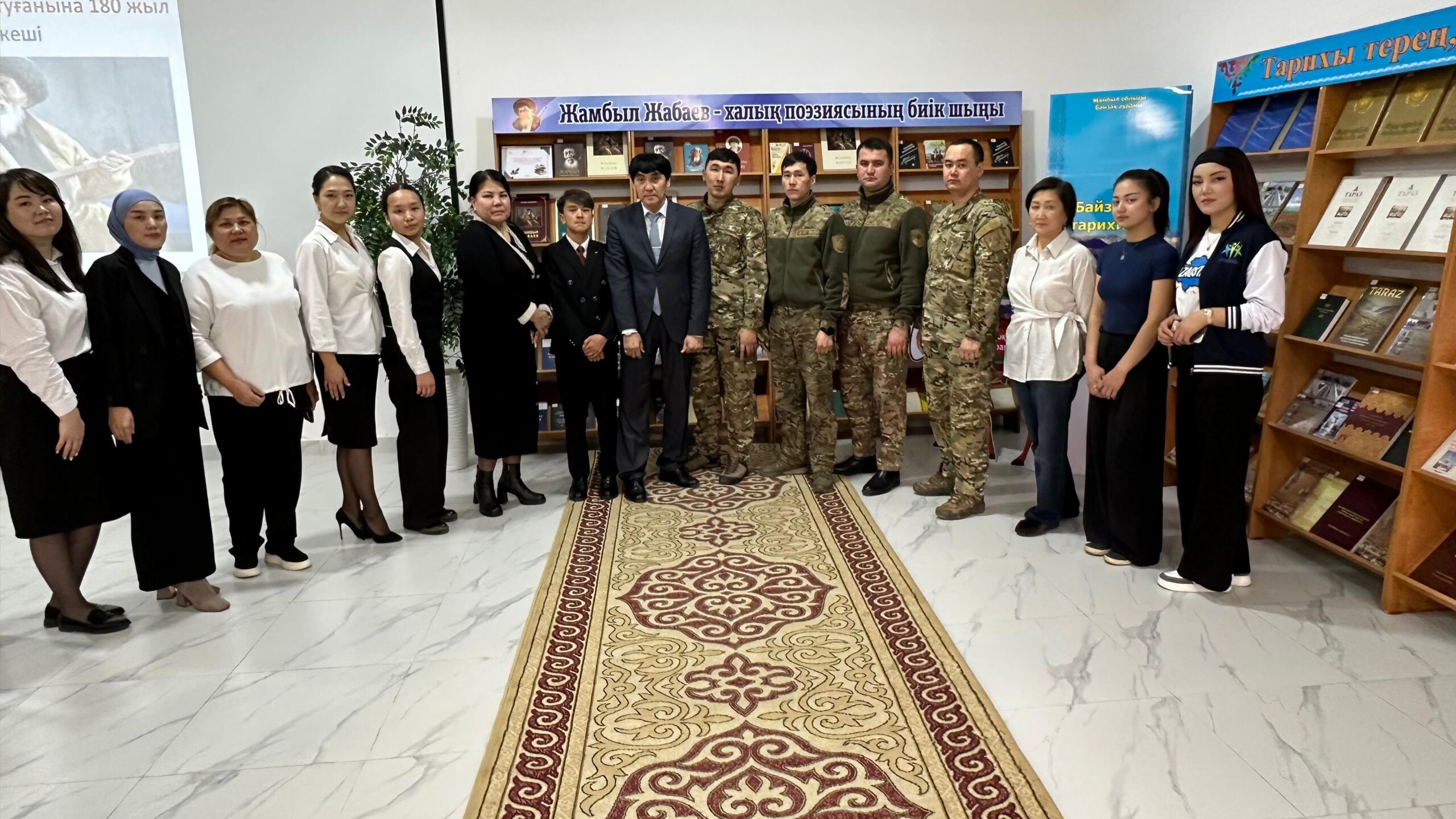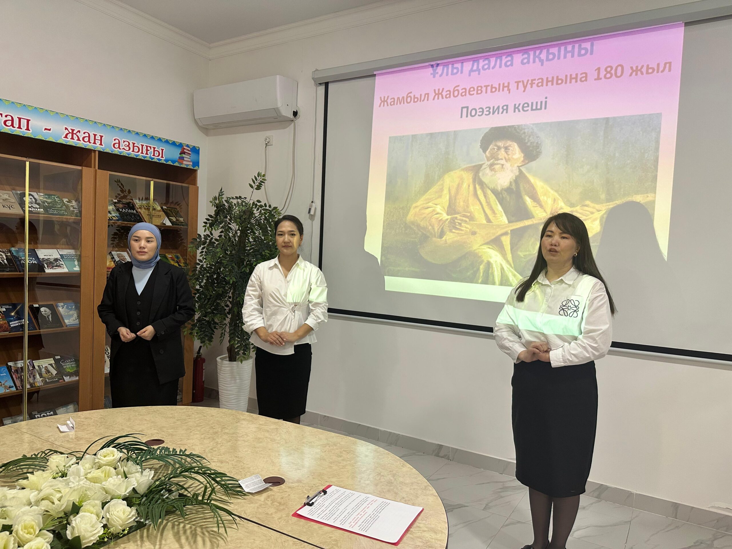 Байзақ аудандық орталық кітапханасында  Жамбыл Жабаевтың туылғанына 180 жыл толуына орай   «Ұлы дала ақыны» атты поэзия кеші өтті. Кешке аудандық төтенше жағдайлар бөлімінің қызметкерлері, Байзақ жастар ресурстық орталығының мамандары қатысты. Іс-шара барысында жыраудың шығармашылығы туралы айтылды. Кітапхана оқырмандары Көбей Назерке, Боранбек Батырхан және кітапханашылар Жамбыл Жабаевтың өлеңдерін оқыды.  Әл-Фараби атындағы мәдениет үйінің әншісі Көпешов Марлен әндерін орындады.   Кеш соңында  “Жамбыл Жабаев – халық поэзиясының биік шыңы” атты кітап көрмесіне шолу жасалды.