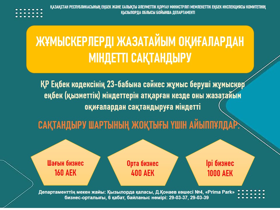 ҚР Еңбек кодексінің 23-бабының 2-тармағының 15) тармақшасына сәйкес, жұмыс беруші жұмыскер еңбек (қызметтік) міндеттерін атқарған кезде оны жазатайым оқиғалардан сақтандыруға міндетті.