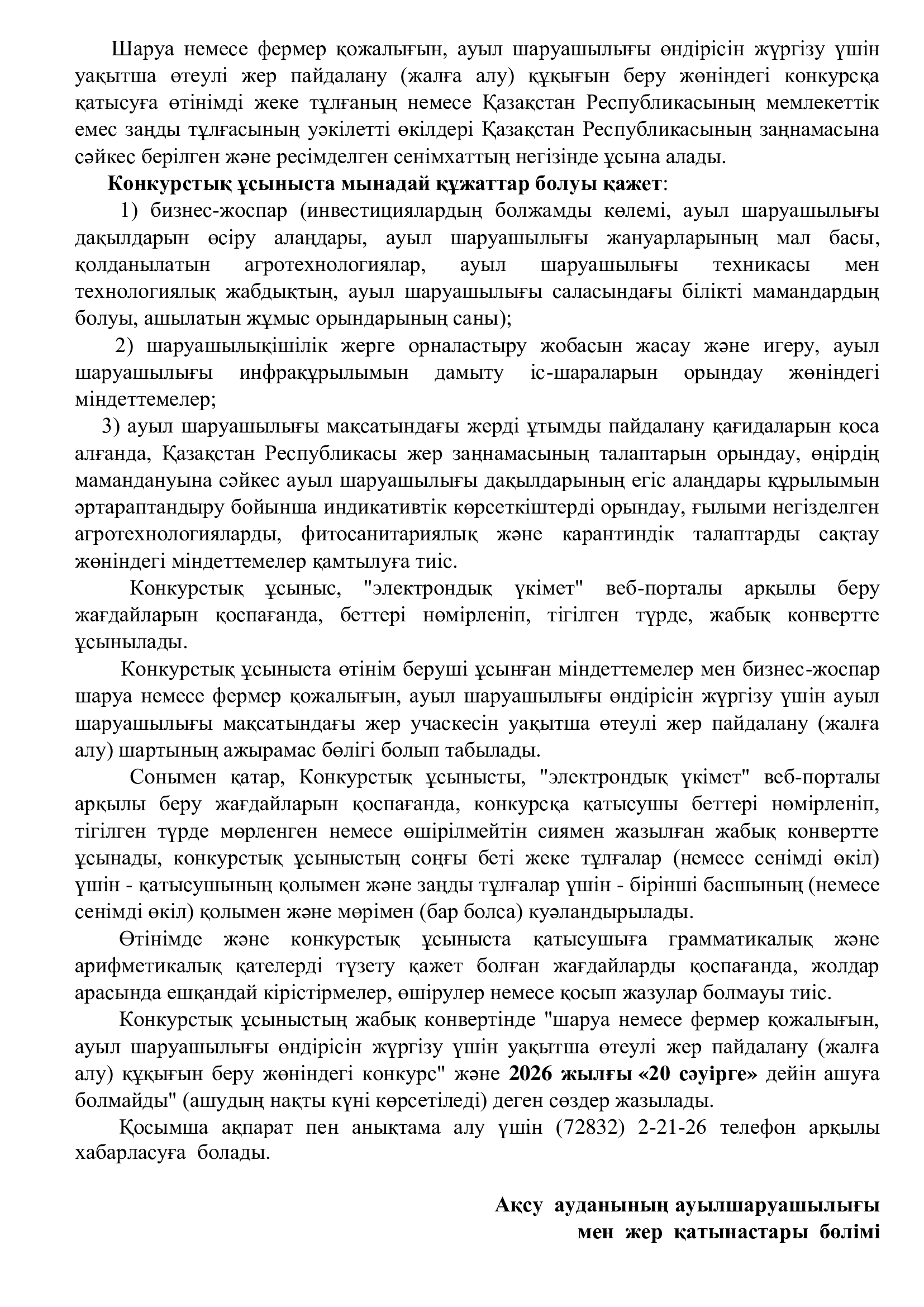 Шаруа немесе фермер қожалығын жүргізу үшін уақытша өтеулі жер пайдалану (жалға алу) құқығын беру жөніндегі конкурс жариялау туралы хабарлама