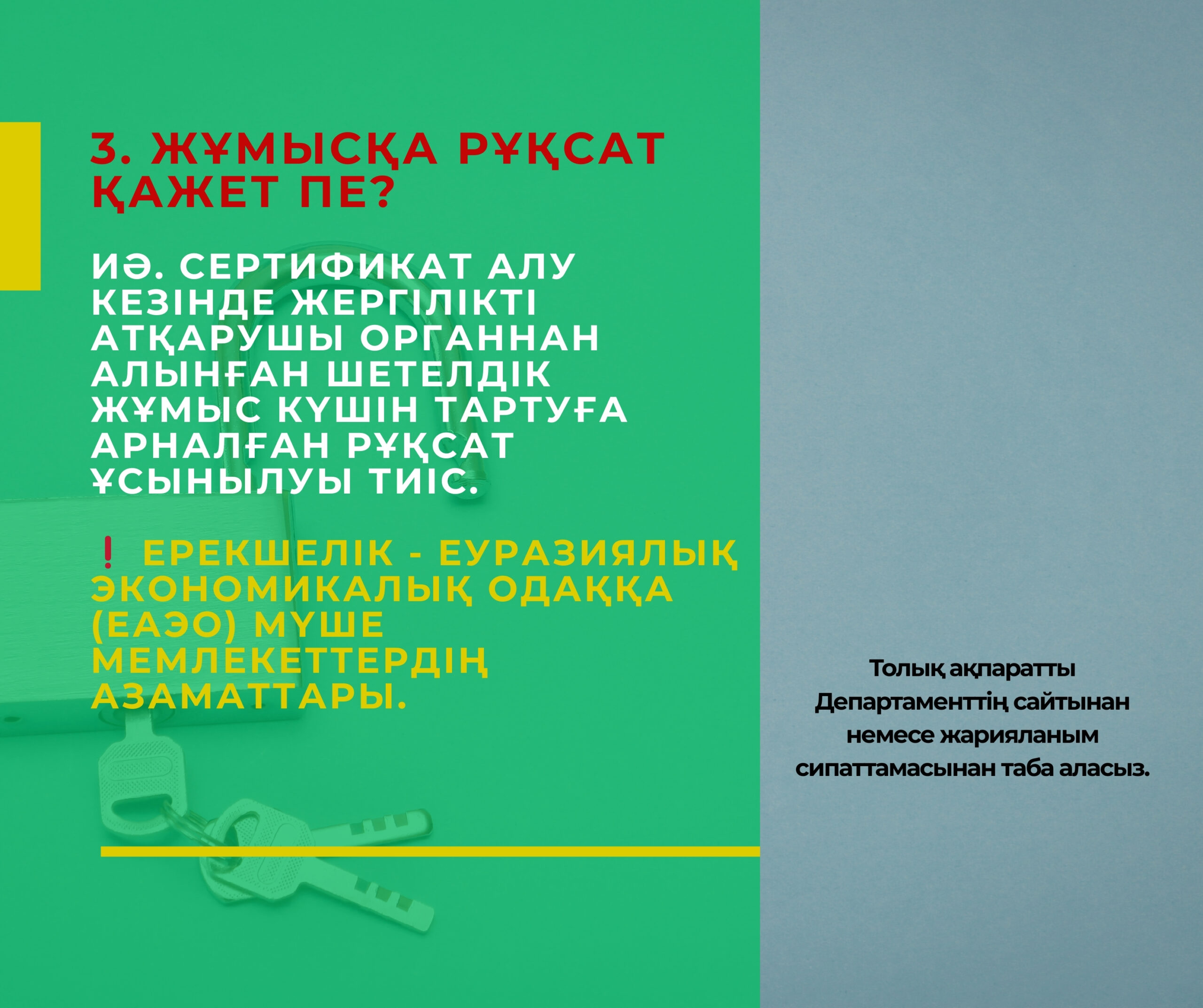 Сонымен қатар, шетелдік мамандар сертификаттау кезінде 2014 жылғы 29 мамырдағы Еуразиялық экономикалық одақ туралы шартқа қатысушы мемлекеттердің азаматтары болып табылатын шетелдік мамандарды қоспағанда, ЖАО-дан алынған шетелдік жұмыс күшін тартуға рұқсатты ұсынуы тиіс.