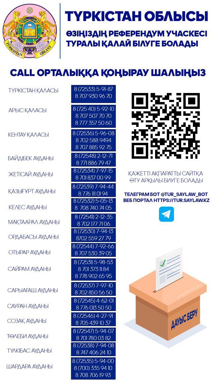 Сондай-ақ облыста «109-бірыңғай» Call-орталығы арқылы да референдум учаскеңіздің мекен-жайы туралы біле аласыз.