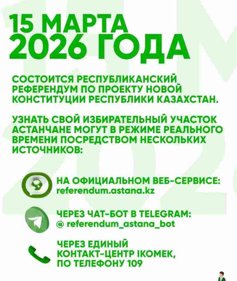 2026 жылғы 15 наурызда Қазақстан Республикасының Жаңа Конституциясының жобасы бойынша республикалық референдум өтеді. Астана тұрғындары сайлау учаскелері туралы ақпаратты бірнеше жолмен біле алады, деп хабарлайды елорда әкімдігінің ресми сайты.