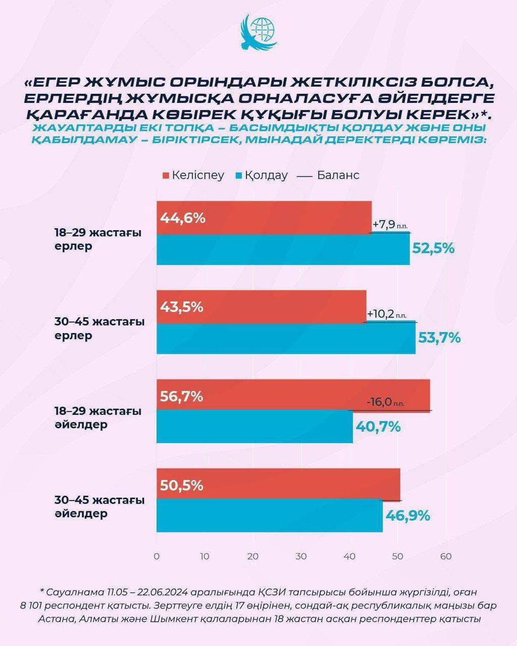 Қазақстандық стратегиялық зерттеулер институты (КИСИ) жүргізген социологиялық сауалнамада респонденттерге: «Егер жұмыс орындары жеткіліксіз болса, ер адамдардың жұмысқа орналасу құқығы әйелдерге қарағанда басым болуы тиіс» деген пікірге баға беру ұсынылған.