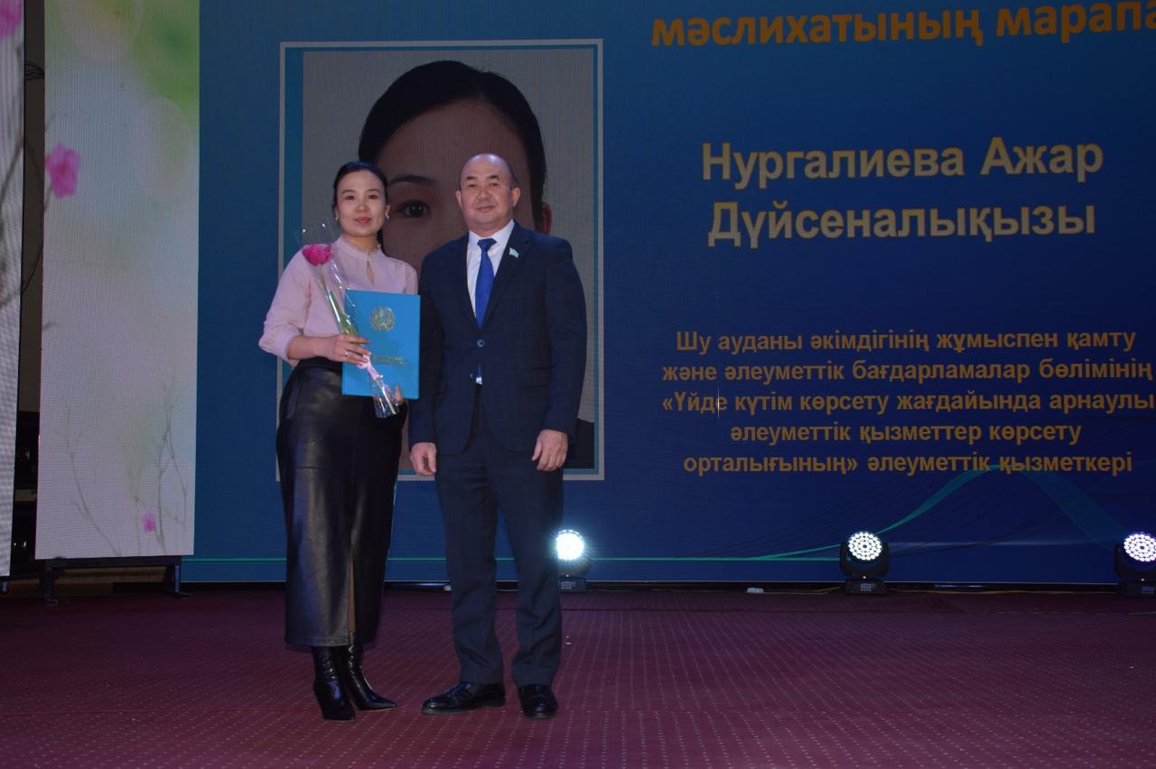 Шу аудандық мәслихат төрағасының 2026 жылғы 5 наурыздағы №12 НҚ өкіміне сәйкес ауданның әлеуметтік экономикалық дамуына, оның ішінде халықты жұмыспен қамту, әлеуметтік көмек, денсаулық сақтау салаларын жетілдірудегі қосып жүрген жемісті еңбектері үшін және «8 -наурыз Халықаралық әйелдер күні» мемекеттік мекересіне орай төмендегілер Шу ауданының Құрмет грамотасымен марапатталды.