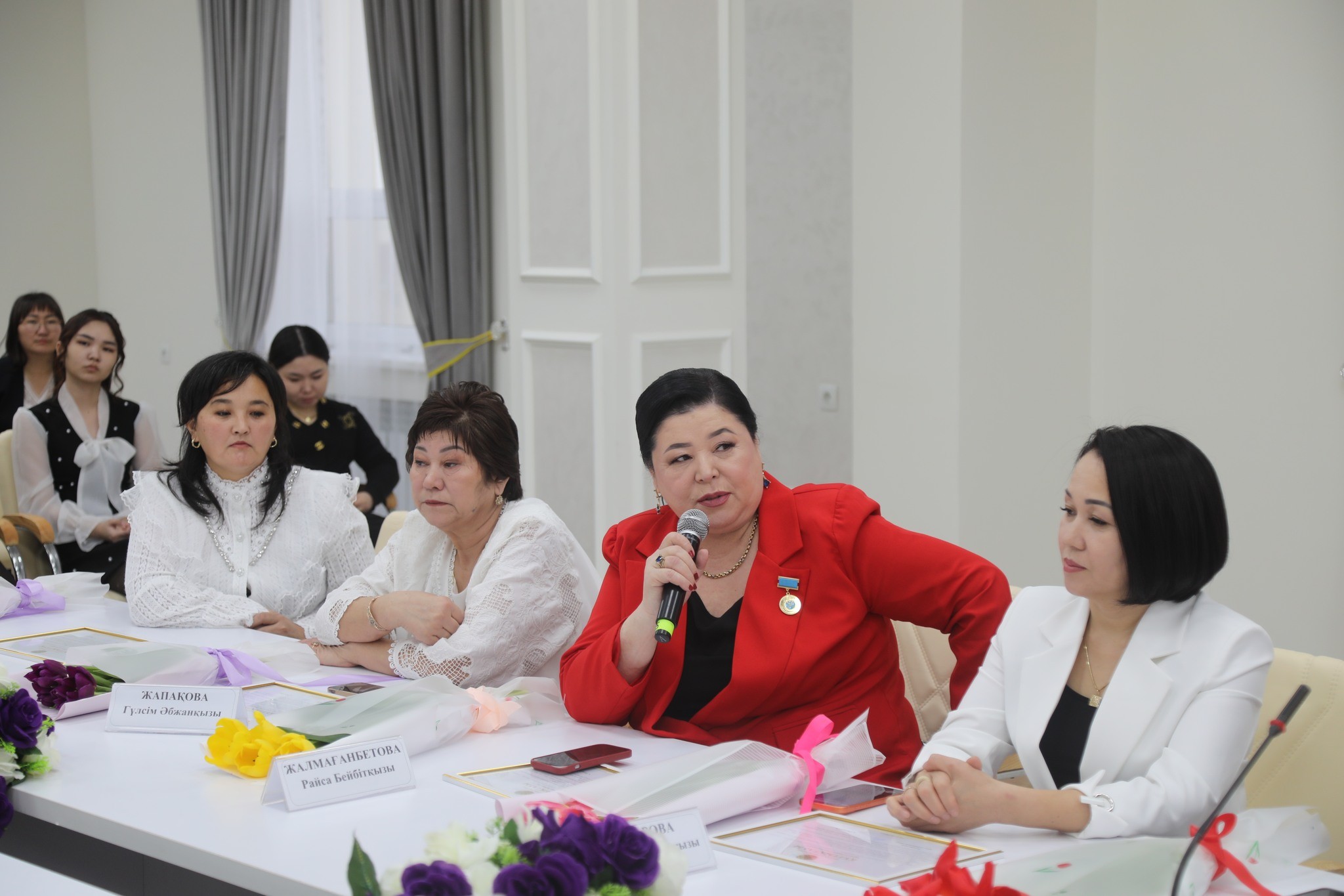Мұнан соң аудандық көпбейінді орталық ауруханасының кардиолог дәрігері Әлия Мырзабаева, балық шаруашылығы саласында ұзақ жылдар бойы еңбек еткен Ақшабақ Батимова және көптеген жас өнерпаздарды тәрбиелеп келе жатқан аудандық әйелдер кеңесінің төрайымы Қанағат Махамбетова кездесуде өз ойларымен бөлісіп, әйелдер қауымына ізгі тілектерін арнады.