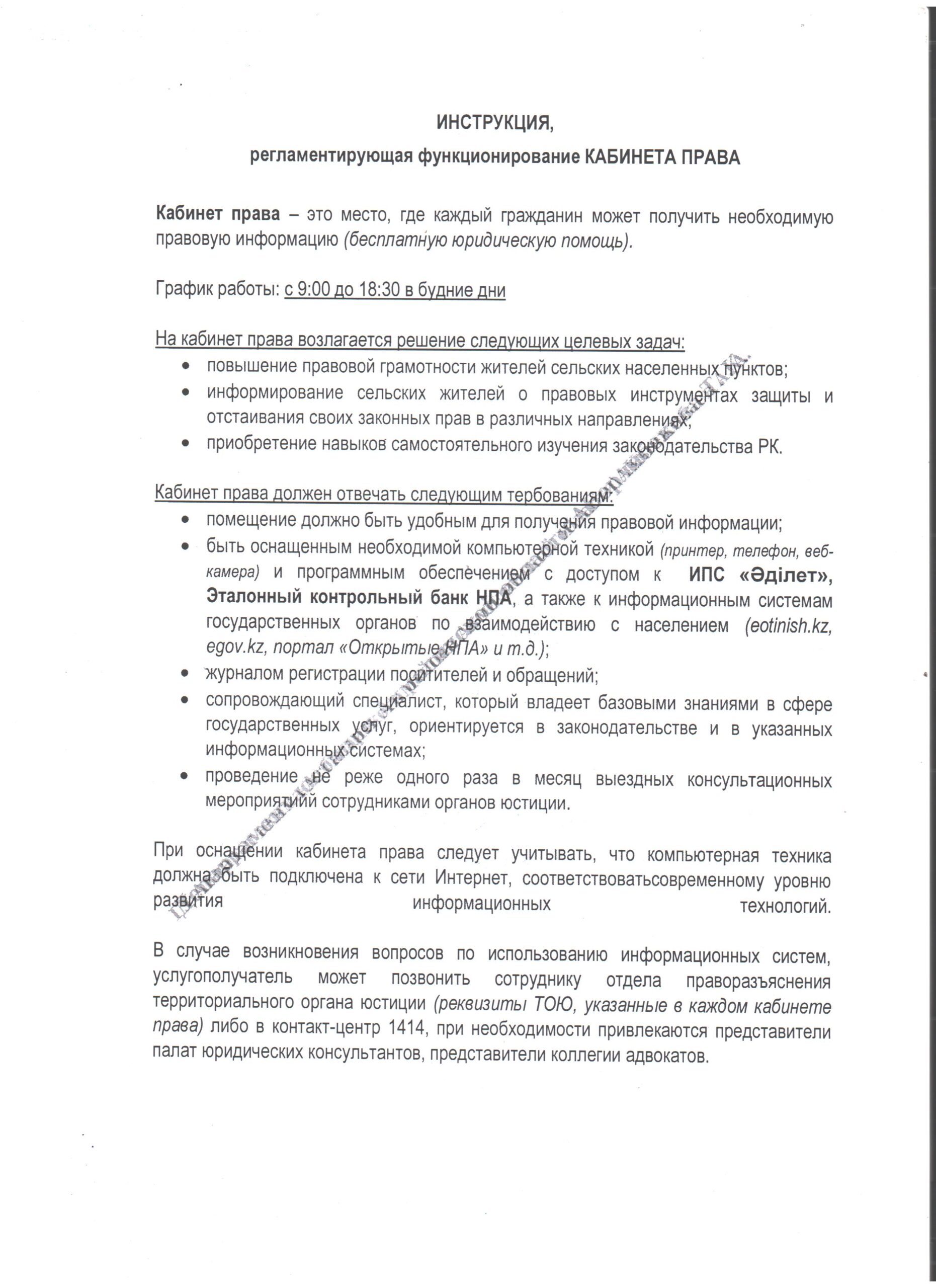 Кабинет қолданыстағы нормативтік құқықтық актілермен танысу үшін «Әділет» ақпаратттық құқықтық жүйесіне, «Заң» деректер базасына, сондай-ақ халықпен өзара іс-қимыл жөніндегі мемлекеттік органдардың ақпараттық жүйелеріне (е-otinish, egov, «Ашық НҚА» порталы және т.б.) қолжетімділігі бар компьютермен (принтер, телефон, веб-камера) жабдықталған.