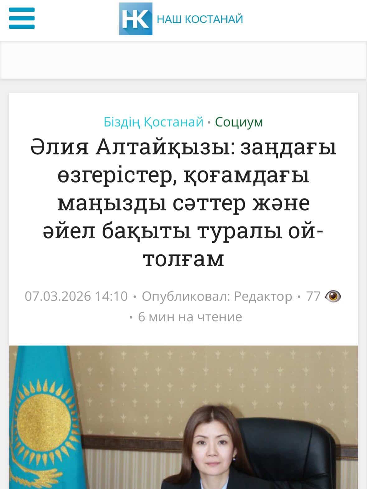 «Заң мен тәртіп» идеологиясын іске асыру аясында 2026 жылдың 7 наурызында Қостанай облысы Әділет департаментінің басшысы Алия Аманжулованың «Біздің Қостанай» газетінде «Заңнамадағы өзгерістер, қоғамдағы маңызды сәттер және әйел бақыты туралы ой-толғам» тақырыбында сұхбаты жарияланды.