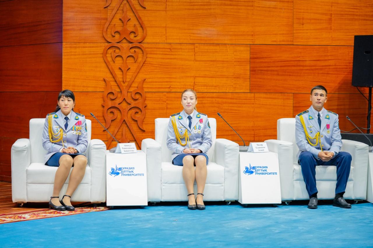 Іс-шараға халықаралық UAE SWAT Challenge турнирінің жеңімпаздары, елордалық полицейлер, әлем чемпиондары – Айнагүл Байжігітова, Мөлдір Атанай және Елдос Сартай арнайы шақырылды. Спикерлер білім алушыларға өздерінің жетістікке жету жолы, жарысқа дайындық барысы, қызметтегі тәртіптің маңызы туралы кеңінен бөлісті.