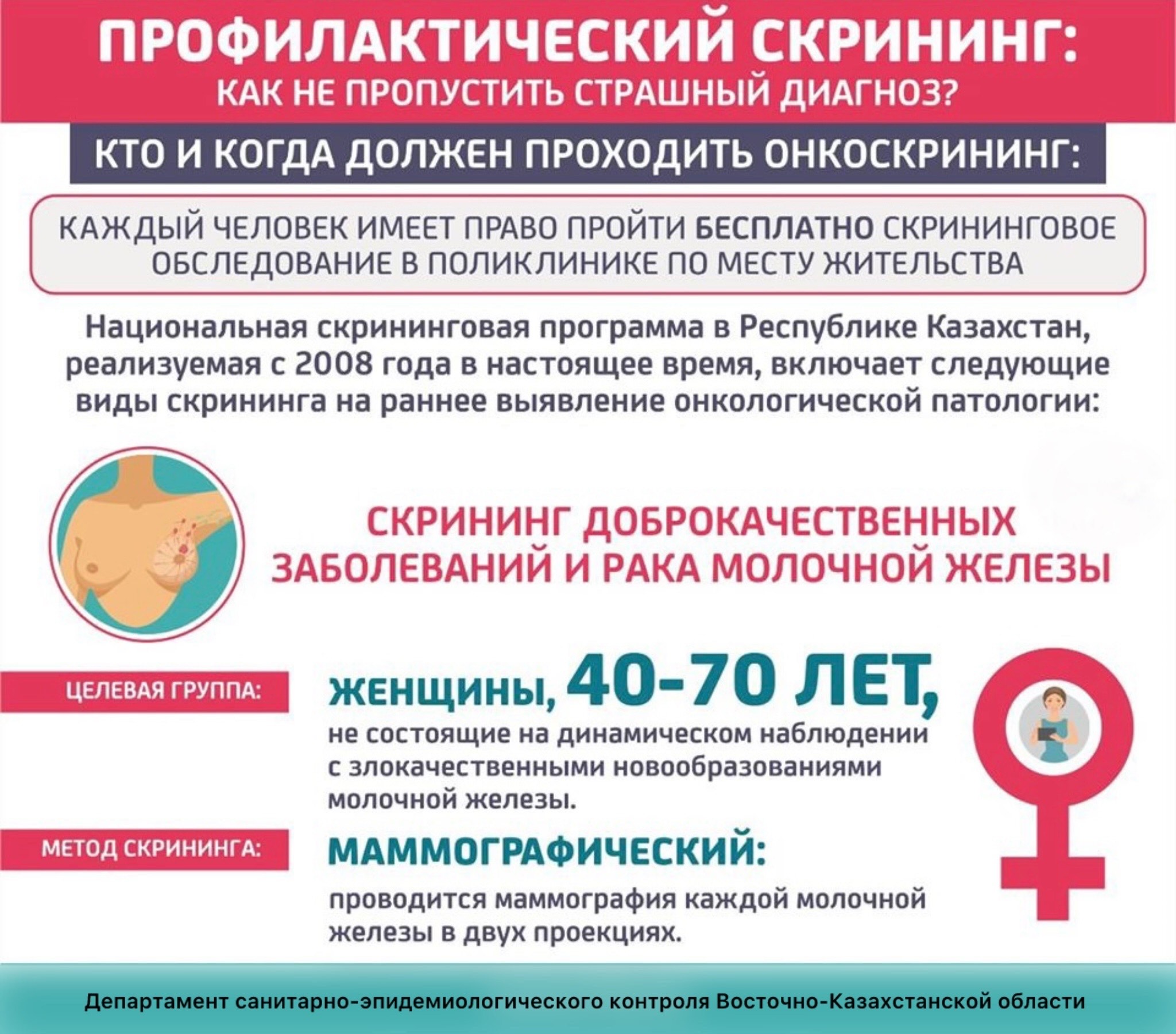 Сүт безі обырына скрининг- әйелдерге маммография әр 2 жыл сайын жүргізіледі;