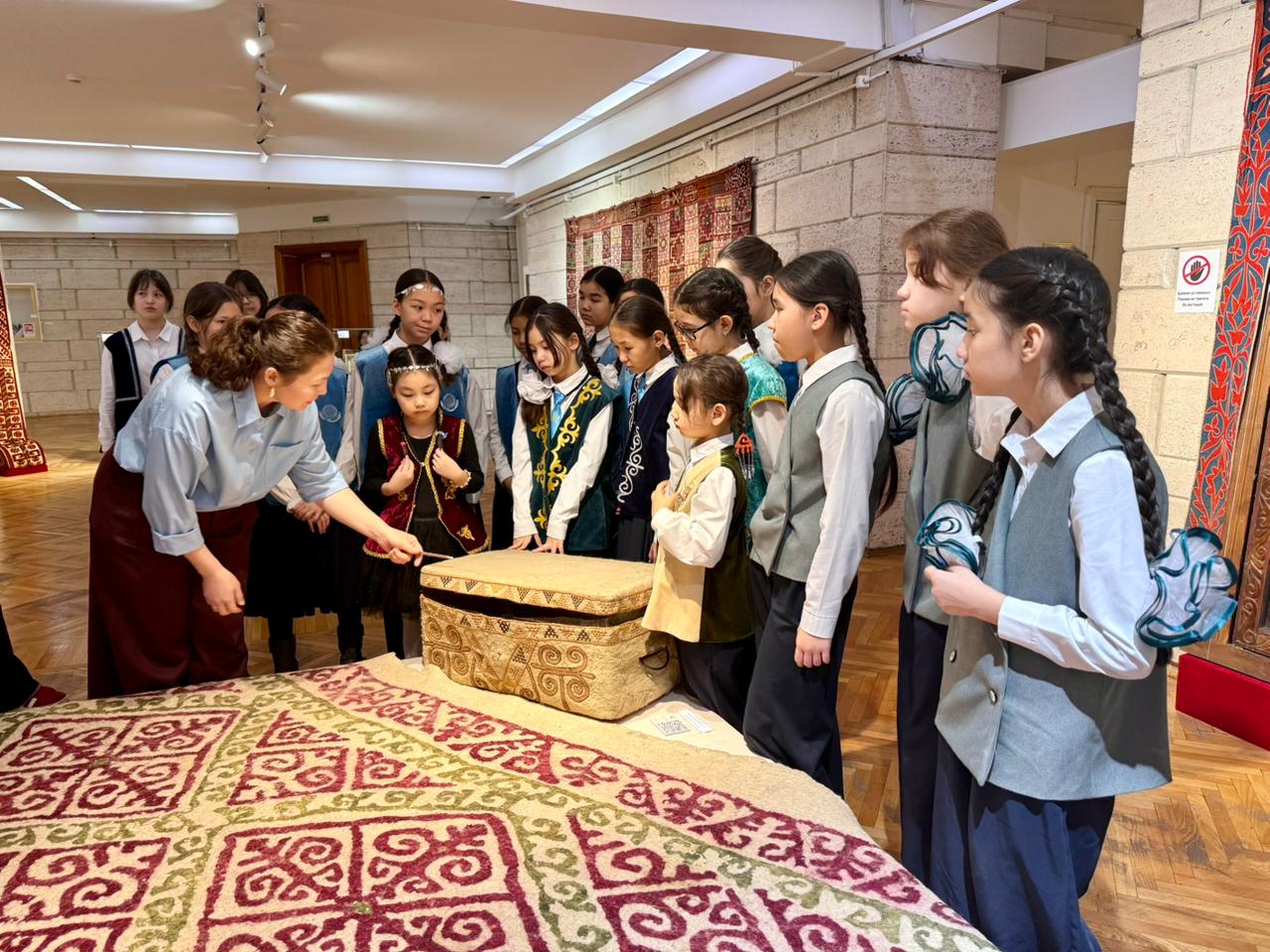 Танымдық жиын барысында оқушылар қазақ халқының сан ғасырлық тарихы мен дүниетанымын бейнелейтін «Өрнекпен өрілген өнер» көрмесін тамашалады. Қатысушыларға алаша, текемет, сырмақ, тұскиіз, тұс кілем, басқұр, кесеқап, қалта, боғжама сынды тоқыма бұйымдары мен қазақ халқының сәндік-қолданбалы өнері туралы толық мағлұмат алды. Сондай-ақ «қошқар мүйіз» оюын негіз еткен зооморфтық, геометриялық және өсімдік тектес ою-өрнектер туралы экскурссия өтті.