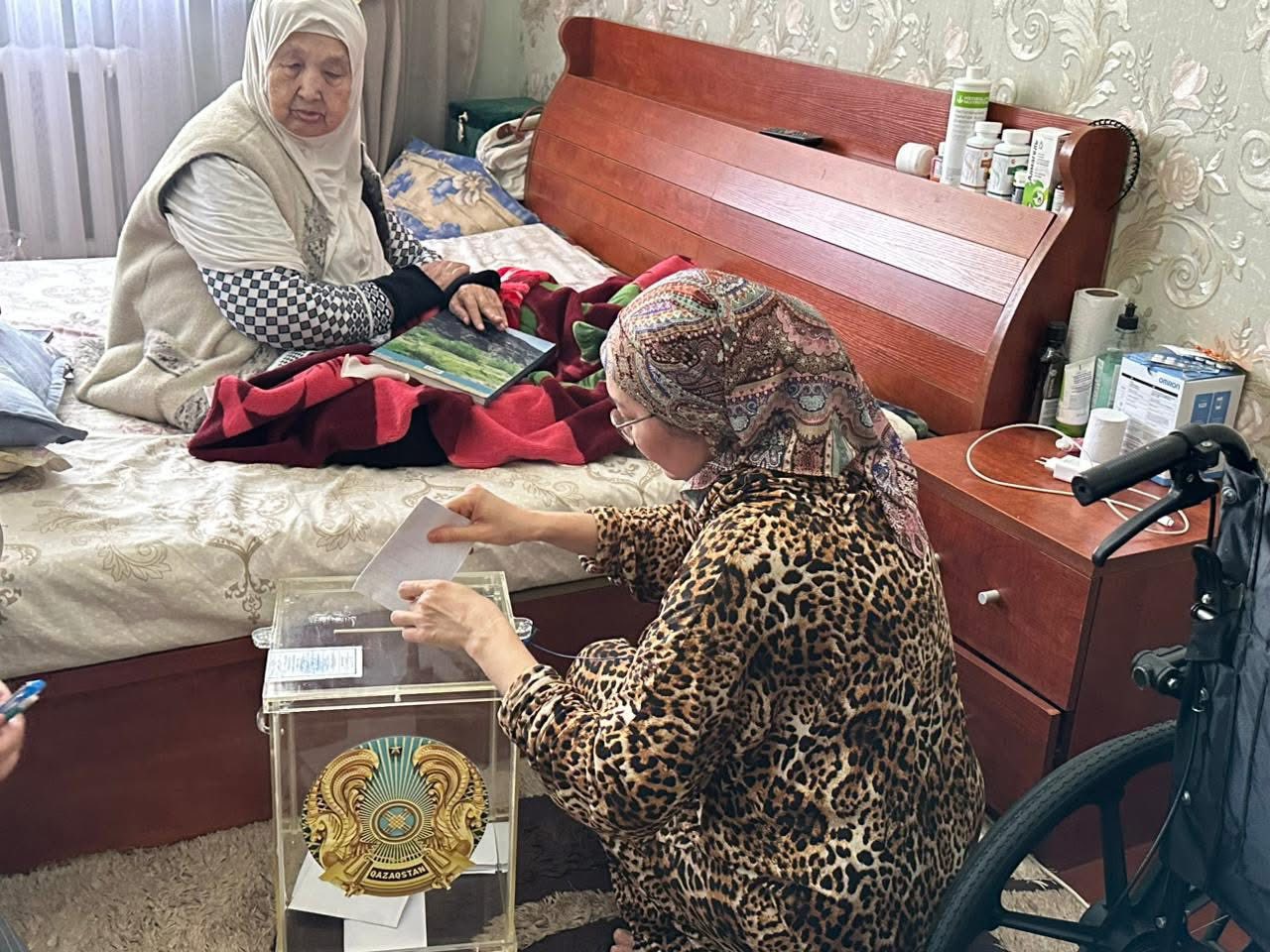 Үйде дауыс беру процесі де жалпы тәртіпке сай жүргізіліп, комиссия мүшелері бюллетеньдердің қауіпсіздігі мен дауыс беру құпиялығын қамтамасыз етуде.