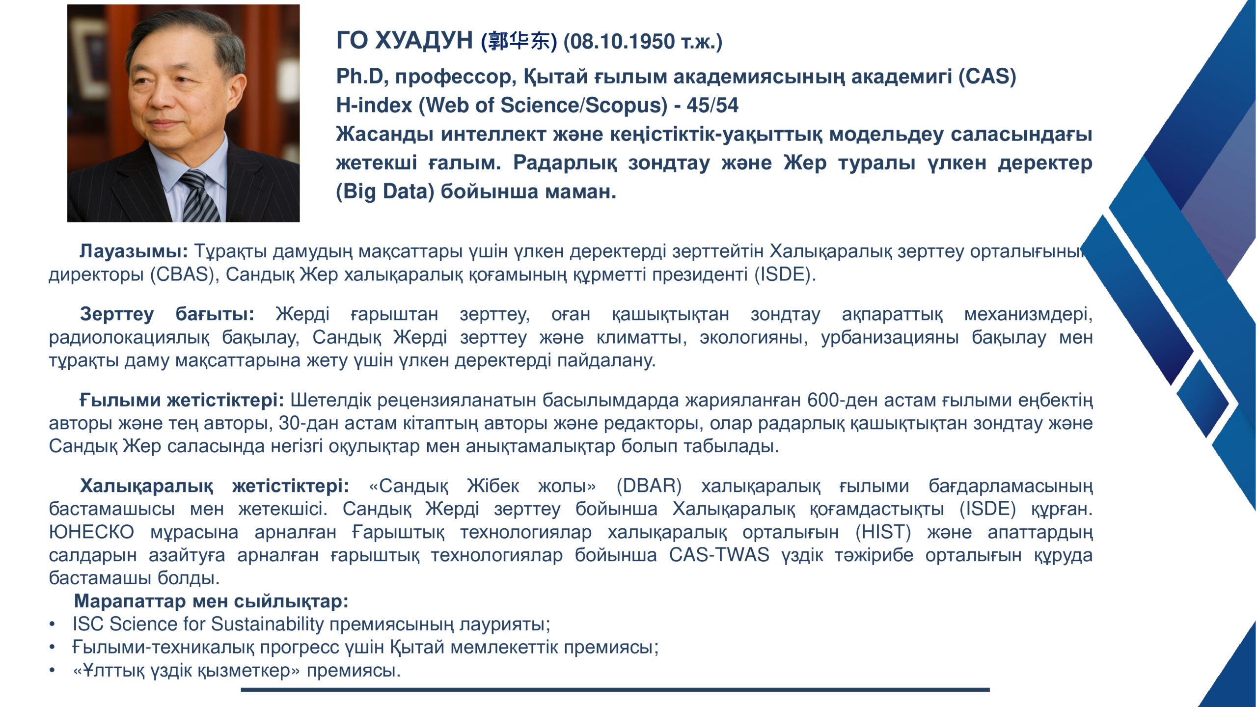 ГО Хуадун (郭华东) – Ph.D, профессор, Қытай ғылым академиясының академигі, Тұрақты даму мақсаттарына арналған Үлкен деректер жөніндегі халықаралық зерттеу орталығының директоры (ҚХР). Жасанды интеллект және кеңістіктік-уақыттық модельдеу саласының жетекші ғалымы. Радиолокациялық зондтау және Жер туралы үлкен деректер саласының маманы.
