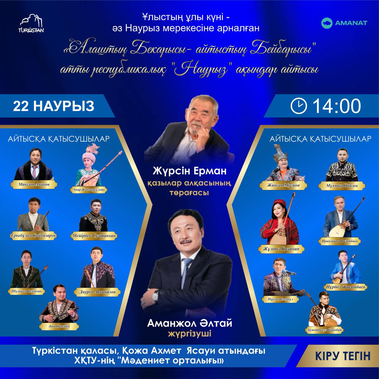 Аламан айтысқа Мақсат Ақанов, Мұхтар Ниязов, Анар Жаппарқұлова, Жансая Мусина, Еркебұлан Қайназаров, Мейірбек Сұлтанхан, Иранғайып Күзенбаев бастаған кіл жүйріктер қатысады.