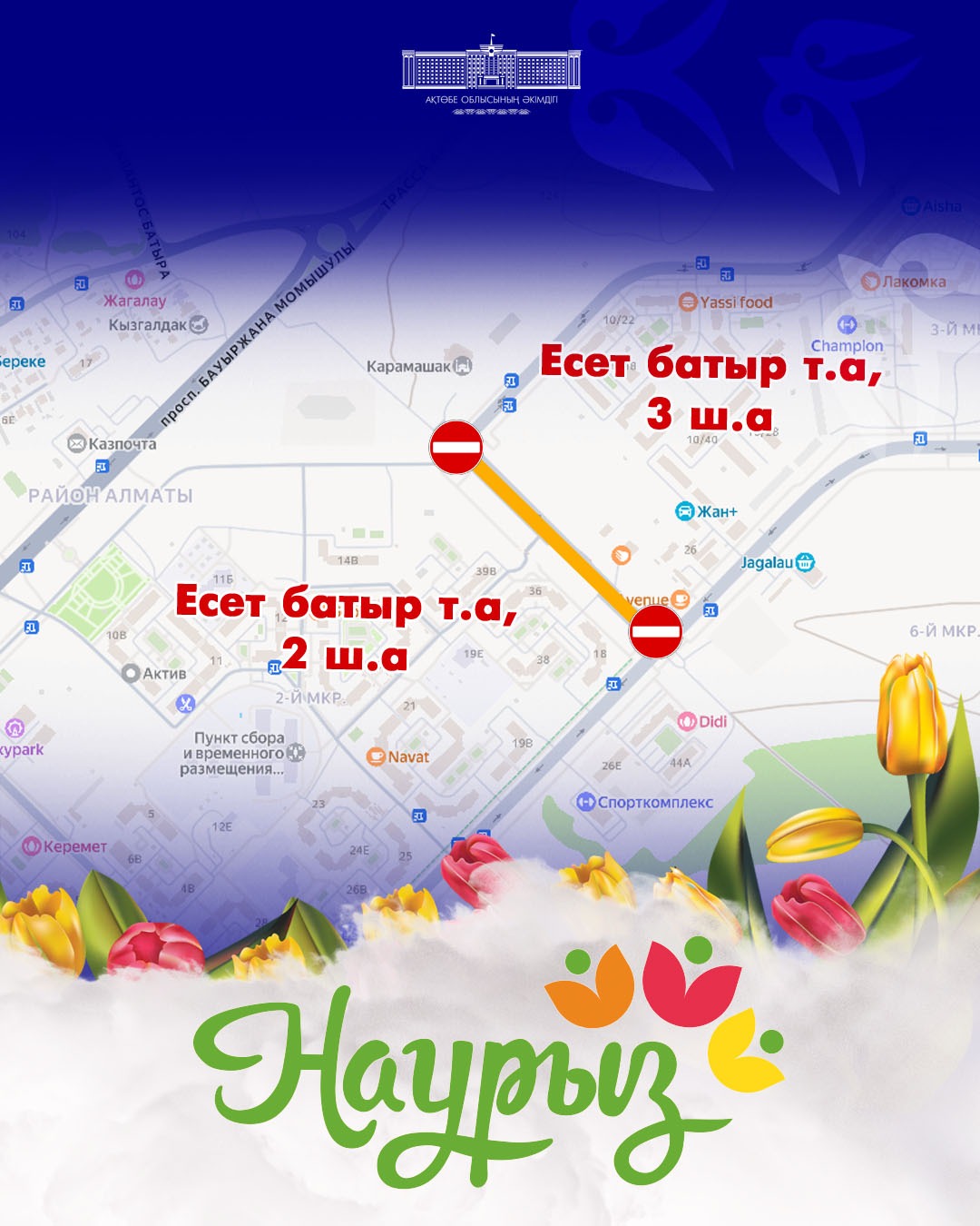 * Сонымен қатар, Есет батыр тұрғын алабының 2-ші және 3-ші шағын аудандарында 2026 жылғы 21 наурыз сағат 12:00-ден 22 наурыз сағат 15:00-ге дейін жол қозғалысына уақытша шектеу қойылады.