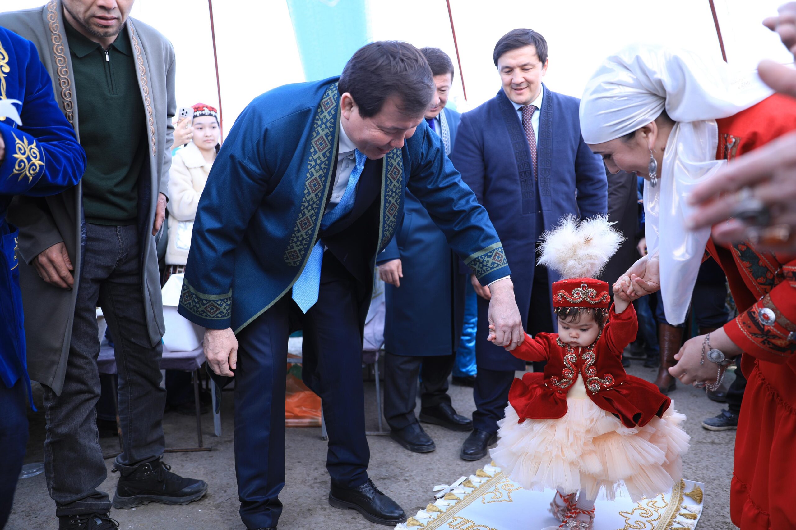 Аймақ басшысы мерекелік алаңды аралап, ұлттық дәстүрлер, қолөнер бұйымдары мен дәм-тағамдар ұсынылған киіз үйлерге кіріп шықты. Ақтөбе қалалық мәслихатының депутаттары құрған киіз үйде ол қала әкімі Азамат Бекетпен бірге «Тұсаукесер» рәсімінің куәсі болды. Айдын және Айқын есімді жақында ғана бір жасқа толған. Ақ жолмен жүріп өткен егіздерге қос басшы жарқын әрі бақытты өмір жолын тіледі.