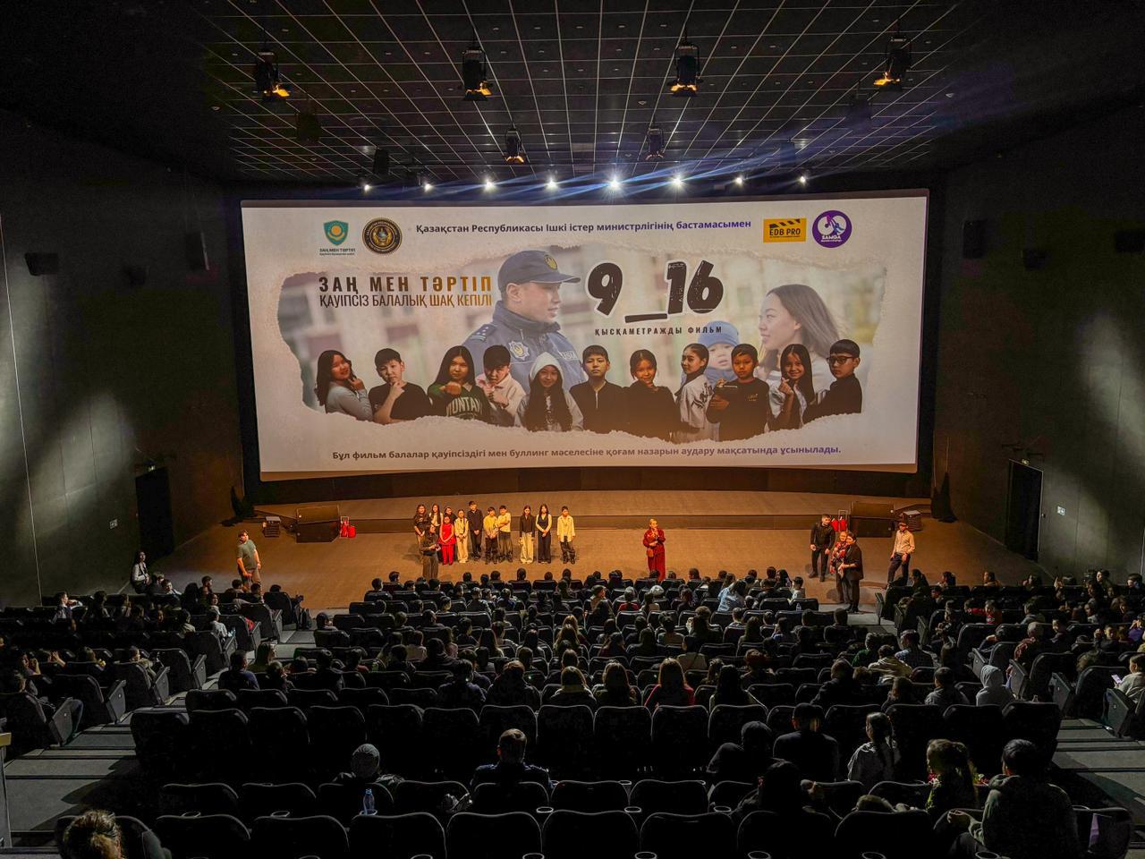 Бүгін «Юбилейный» кинотеатрында өткен «9_16» қысқаметражды фильмінің премьерасына 400-ден астам оқушы, ата-аналар мен қонақтар жиналды.