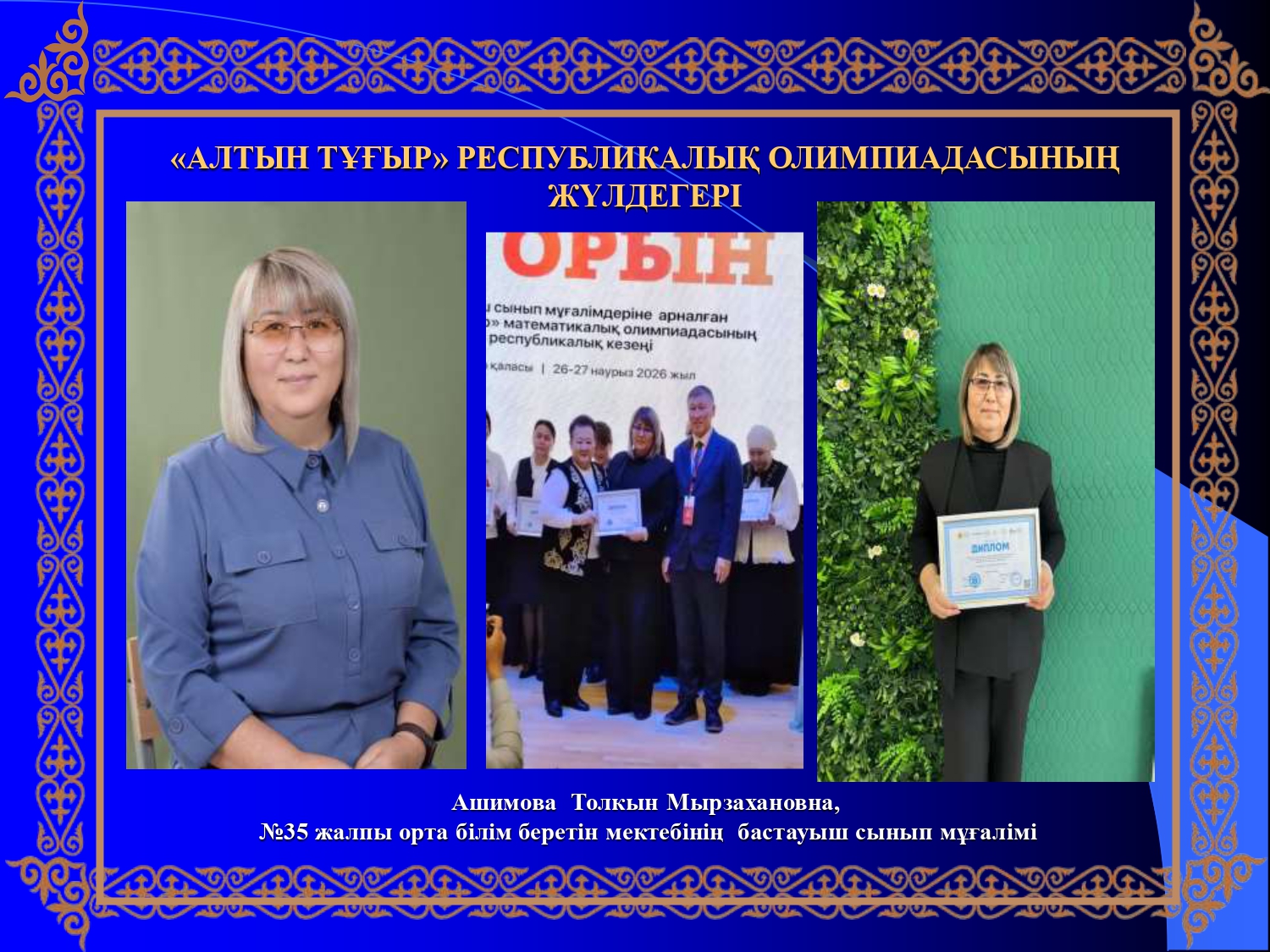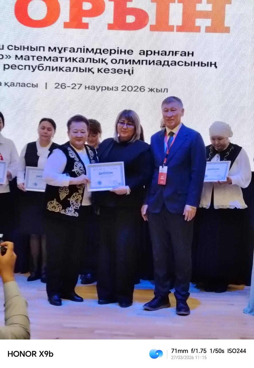 ♦️2026 жылғы 26-27 наурызда «Зерделі ақыл-ой дамыту» білім беру орталығы және «Дарын» Республикалық ғылыми-тәжірибелік орталығының ұйымдастыруымен өткізілген бастауыш сынып мұғалімдеріне арналған «Алтын тұғыр» Республикалық математикалық олимпиадасының республикалық кезеңіне Семей қаласы №35 жалпы орта білім беретін мектебінің бастауыш сынып мұғалімі Ашимова Толкын Мырзахановна қатысты.