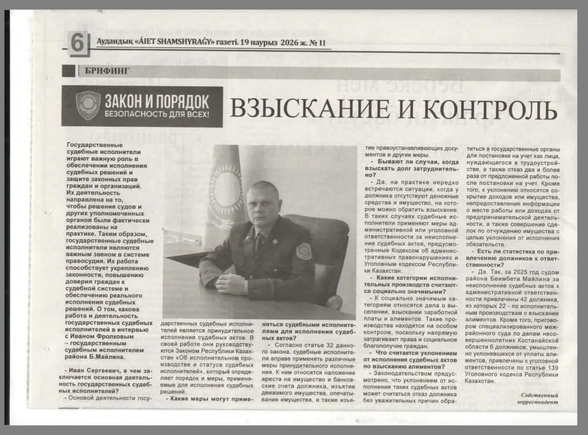 «Заң мен тәртіп» идеологиясын іске асыру аясында 2026 жылдың 19 наурызында Бейімбет Майлин ауданының ауданаралық мәжбүрлеп орындату аумақтық бөлімінің басшысы Иван Фролковтың мақаласы жарияланды.