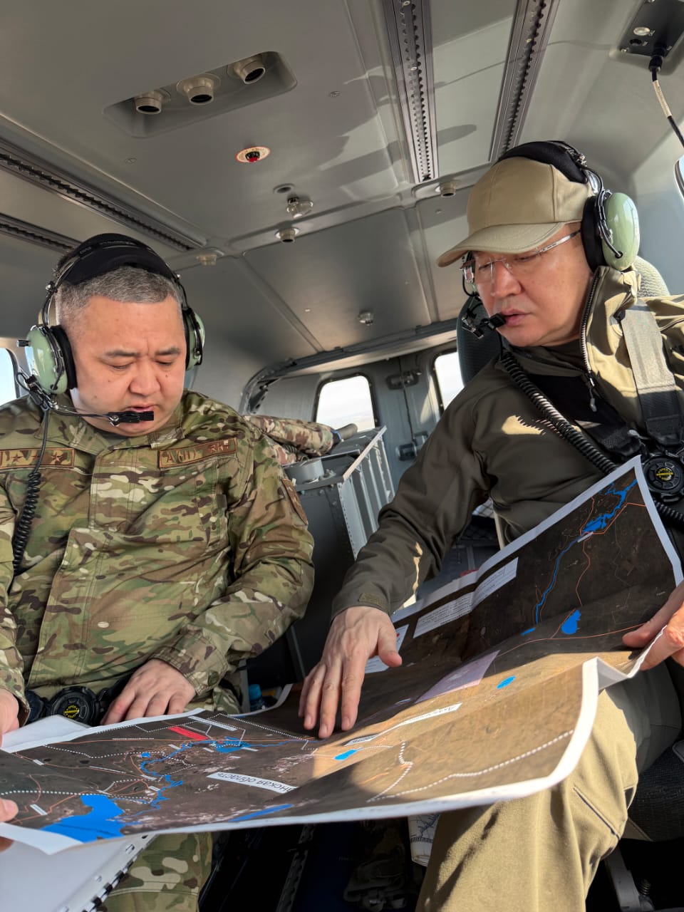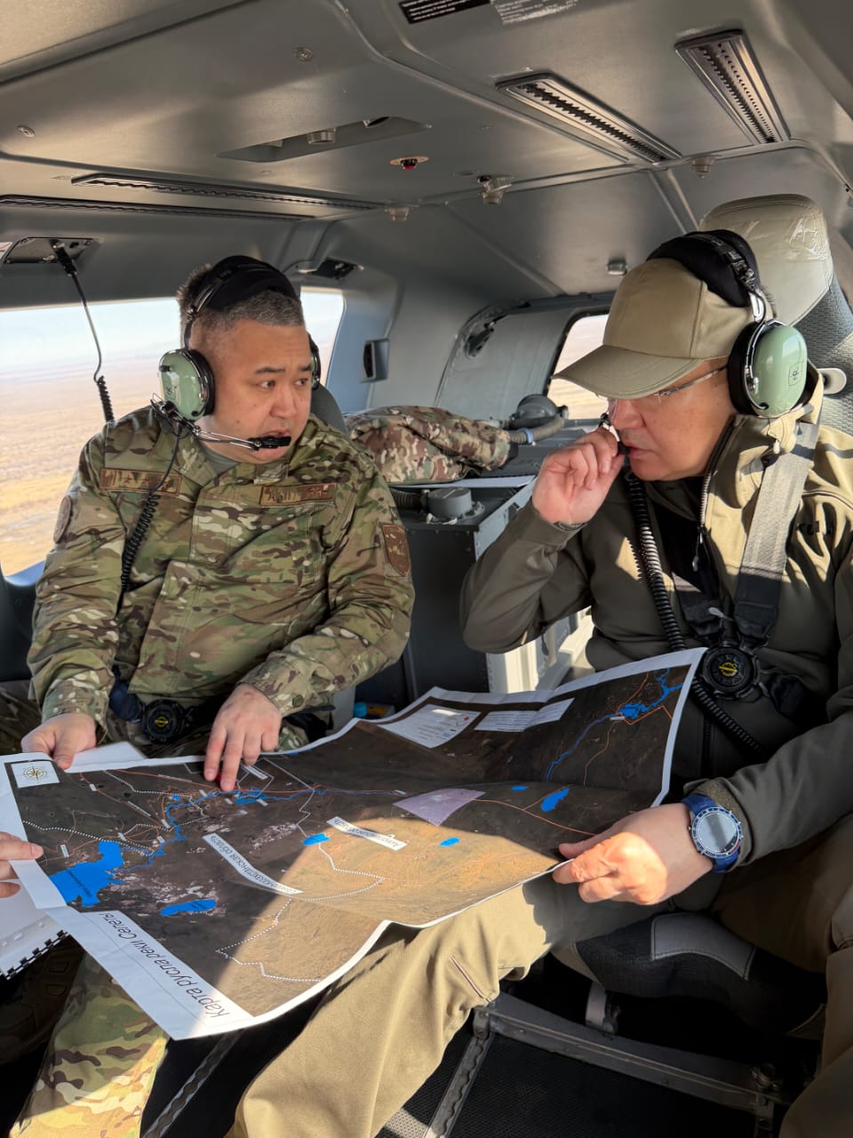 Өңір басшысы төтенше жағдайлар департаментінің өкілдерімен бірге әуеден барлау жасап, Ақтоғай ауданындағы су тасқыны жағдайымен танысты және еріген қар сулары жиналған учаскелер мен инженерлік қорғаныс нысандарының жай-күйін тексерді. Әуеден барлау бағыты Шұға, Шолақсор, Жалаулы және ауданның басқа да елді мекендерінің үстімен өтті.