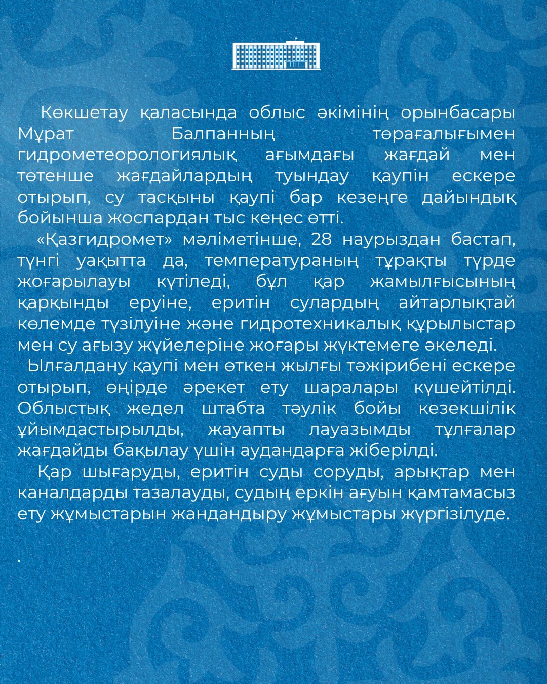 Көкшетау қаласында облыс әкімінің орынбасары Мұрат Балпанның төрағалығымен ағымдағы гидрометеорологиялық жағдай мен төтенше жағдайлар қаупінің жоғарылауын ескере отырып, су тасқыны кезеңіне дайындық мәселелері бойынша кезектен тыс кеңес өтті.