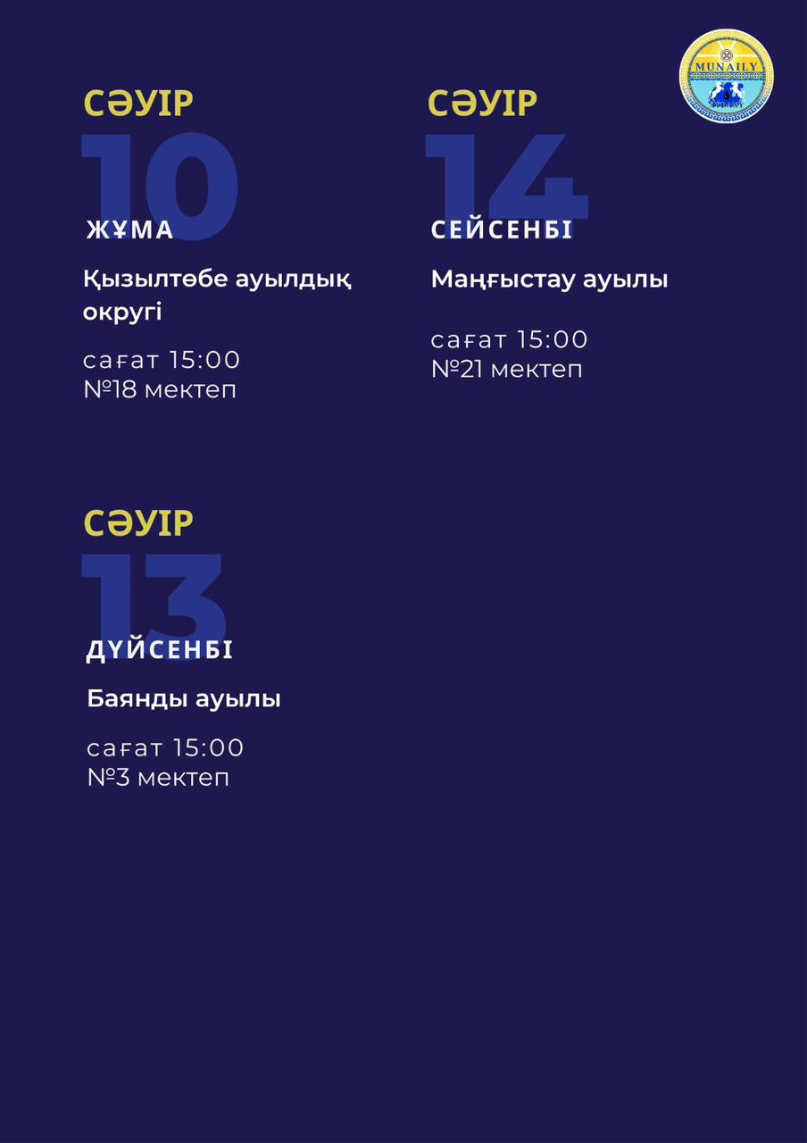 Мұнайлы ауданы әкімінің халықпен есеп беру кездесу кестесі.
