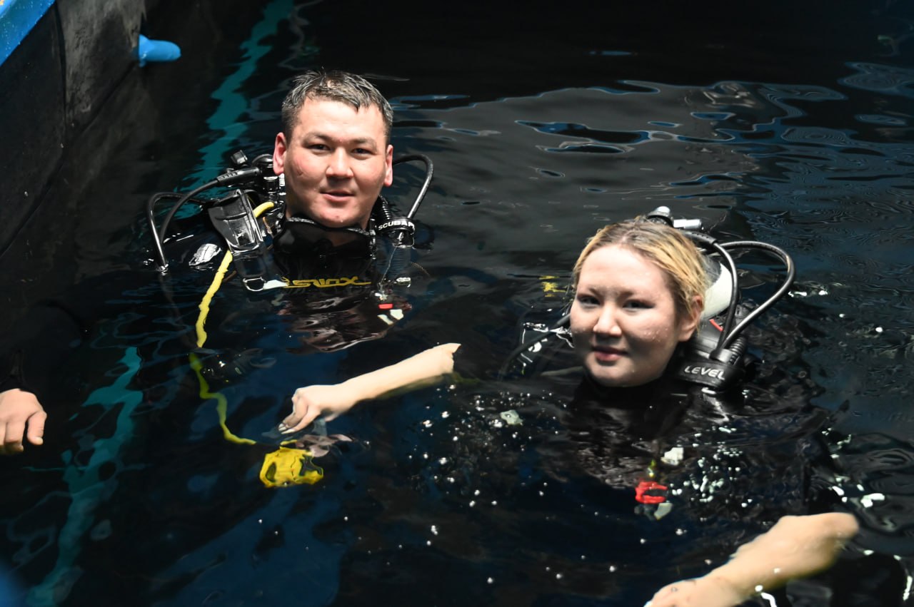 Республикалық телеарналардың бірінің өкілі олардың функционалдық мүмкіндігін тәжірибе жүзінде тексеріп көрмек боп, арнайы нұсқаушымен бірге сүңгуір жабдығымен суға түсті.