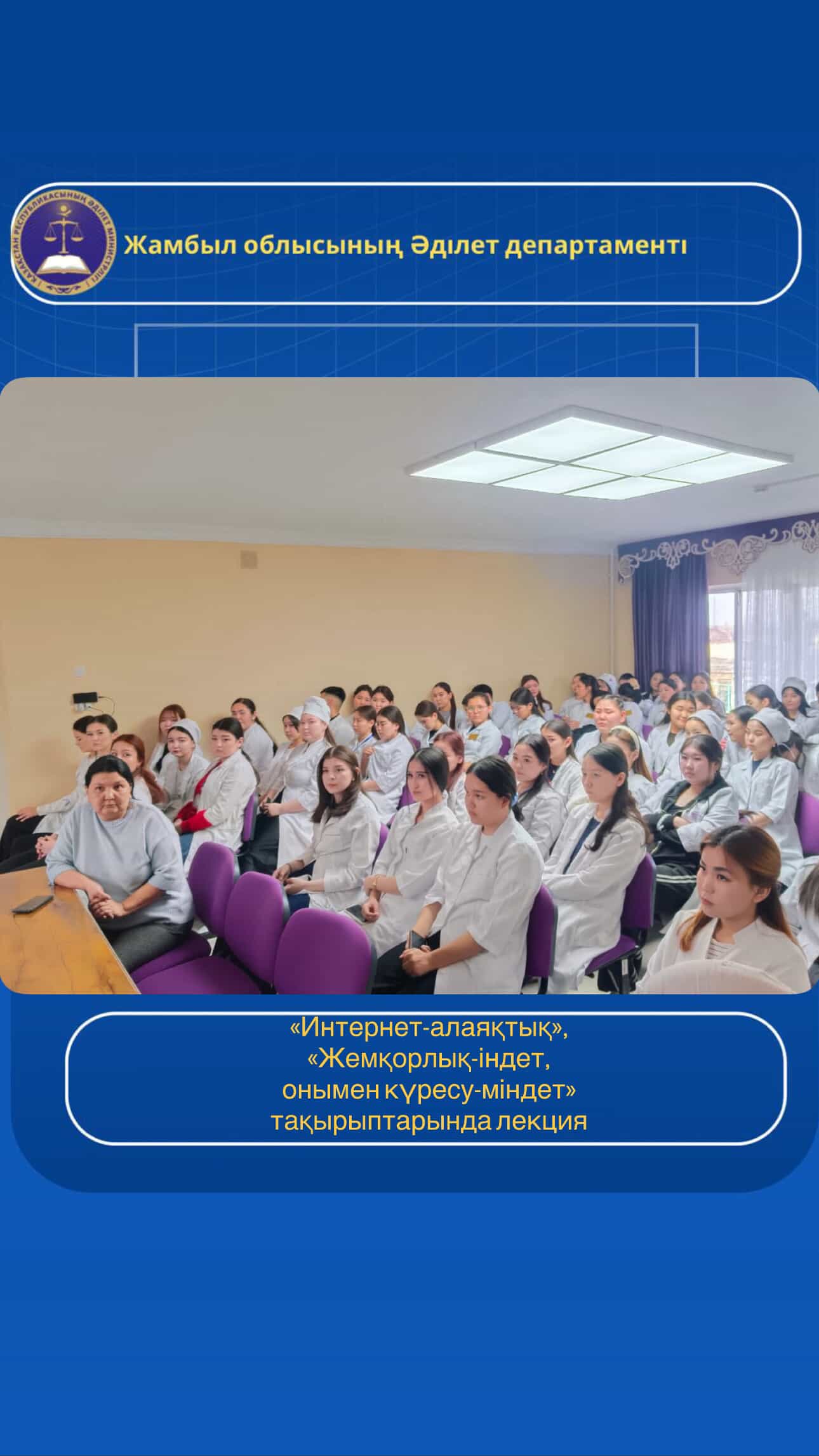 26.03.2026 жылы, Жамбыл облысы Әділет департаментінің коммерциялық емес ұйымдарды тіркеу және тіркеу қызметі саласындағы бақылау бөлімінің бас мамандары Р. Норматова, Ж. Досмырзаевамен және адвокат Д. Арғынбаевмен “Жамбыл облысы әкімдігінің денсаулық сақтау басқармасы “Жамбыл жоғары медициналық колледжі” шаруашылық жүргізу құқығындағы коммуналдық мемлекеттік кәсіпорнында «Интернет-алаяқтық», «Жемқорлық-індет, онымен күресу-міндет» және «Сот шешімін тек сот арқылы және заңда белгіленген тәртіппен шағымдану» тақырыптарында лекция оқылды.