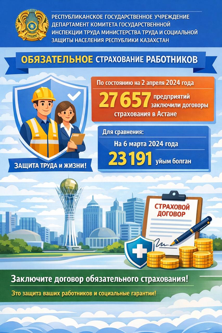 Еңбек заңнамасын сақтау және қызметкерлердің өмірі мен денсаулығын қорғау мақсатында жұмыс берушілерден міндетті сақтандыру шартын уақтылы жасасуды сұраймыз. Бұл мүмкін болатын әкімшілік жауапкершіліктен аулақ болып қана қоймайды, сонымен қатар жұмысшыларға қосымша қолдау мен олардың жұмыс орнындағы қауіпсіздігіне сенімділік береді.