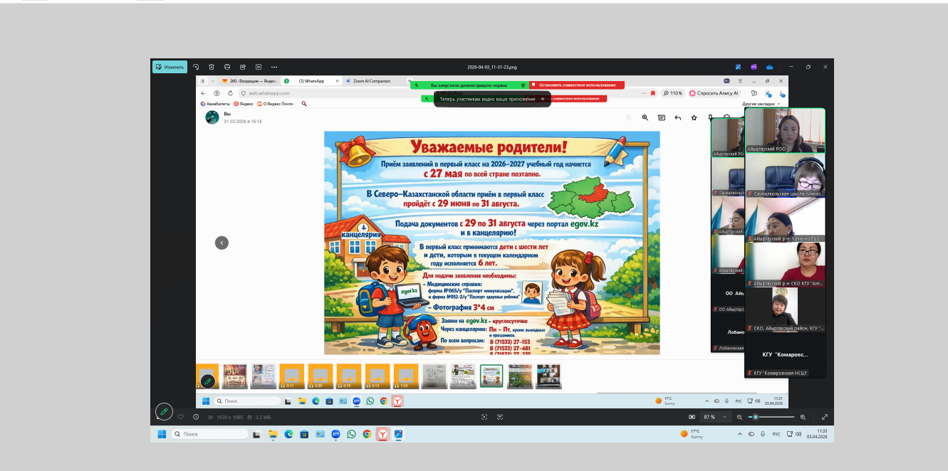 2026 жылдың 03 сәуір күні Айыртау ауданының білім беру мекемелерінің басшыларымен онлайн-режимде кеңес өтті. Кездесу барысында білім беру процесін ұйымдастыру және білім беру мекемелерінде қауіпсіздікті қамтамасыз етудің өзекті мәселелері қаралды.