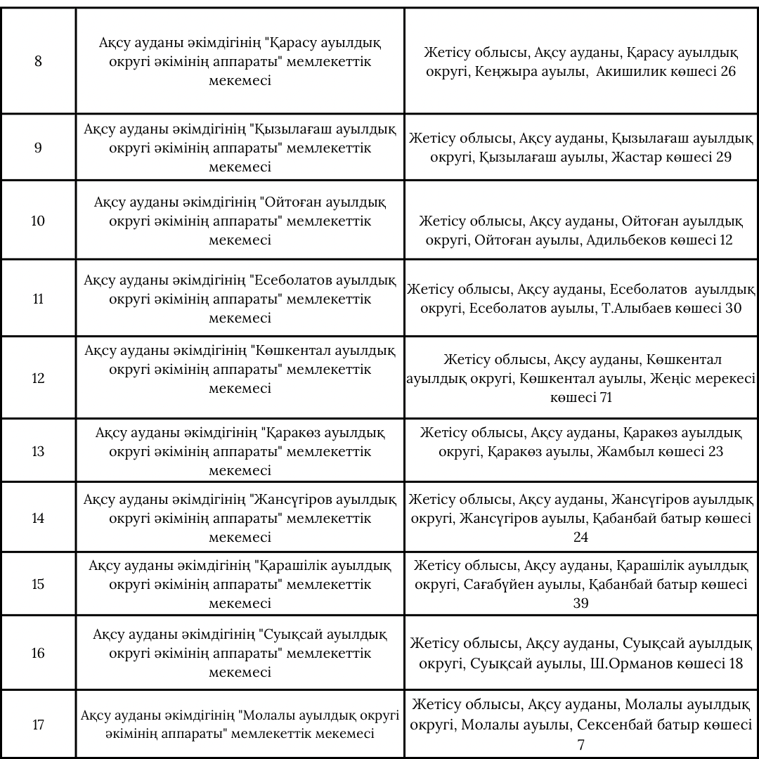 Жетісу облысының аумағында ашылған «Құқық кабинеттерінің» жаңартылған тізім