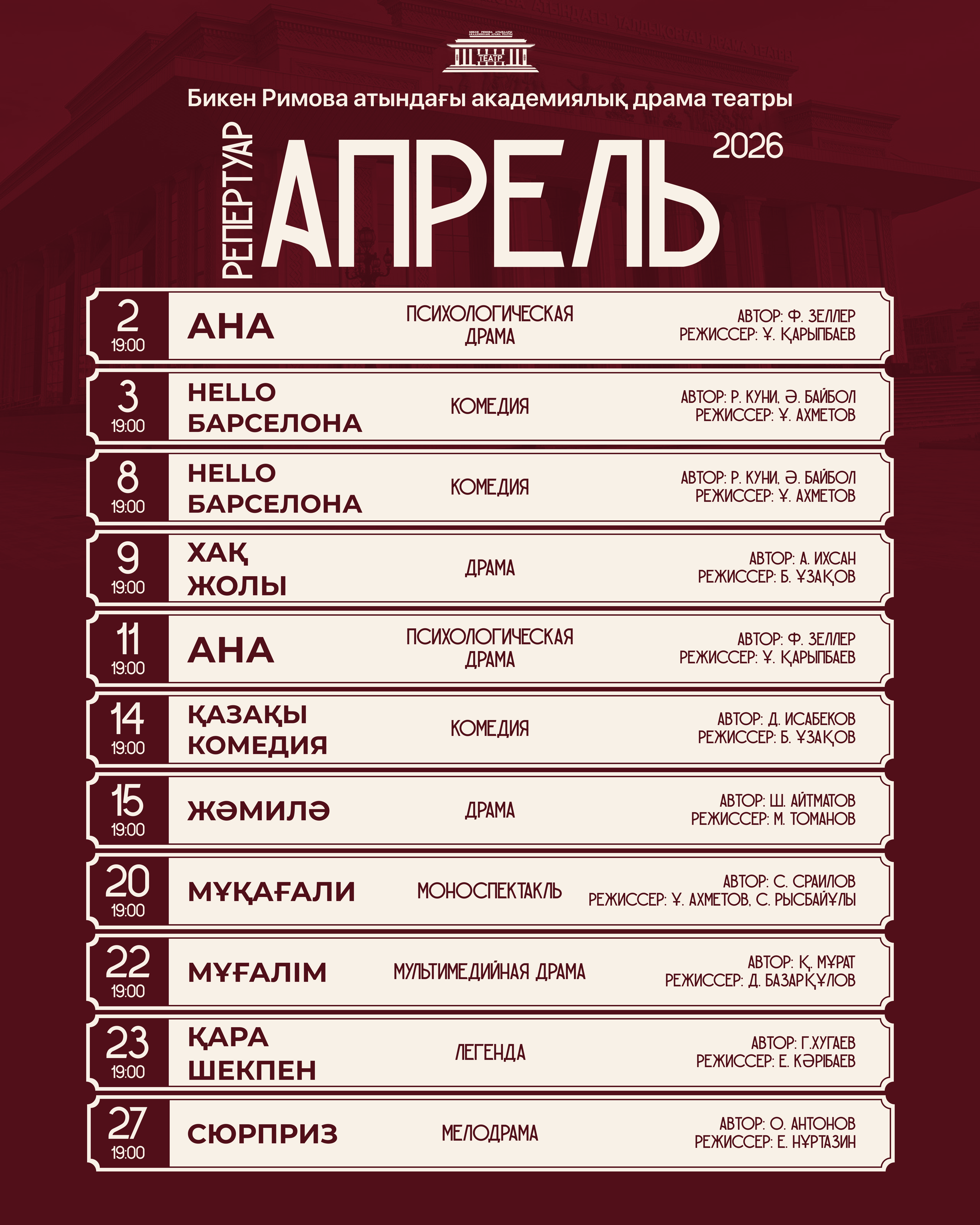 Бикен Римова атындағы академиялық театрының сәуір айындағы репертуары
