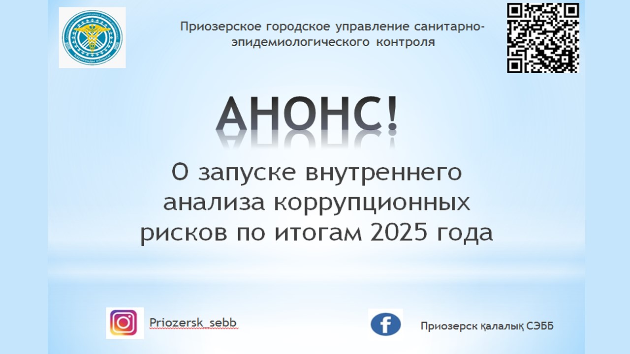 Приозерск қалалық санитариялық-эпидемиологиялық бақылау басқармасы 2025 жылғы қызмет қорытындылары бойынша сыбайлас жемқорлық тәуекелдеріне ішкі талдау жүргізу басталғаны туралы хабарлайды.