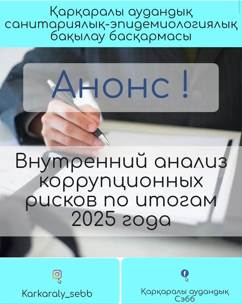 Қарқаралы аудандық санитариялық-эпидемиологиялық бақылау басқармасы 2025 жылдың қорытындысы бойынша басқарма қызметінің сыбайлас жемқорлық тәуекелдеріне ішкі талдау жүргізілетінін хабарлайды.