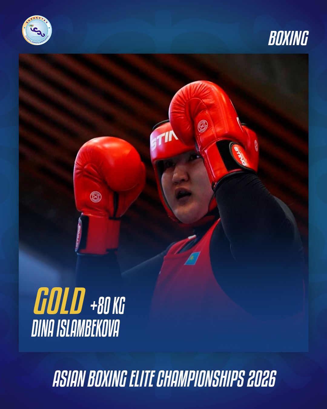 Аса ауыр салмақта бақ сынайтын (+80 кг) Дина Исламбекова шешуші кезеңде Альфия Тараннум Хан Патанмен (Үндістан) кім мықтыны анықтады. Бес раунд нәтижесінде қазақ боксшысы басым түсті. Есеп: 5-0.