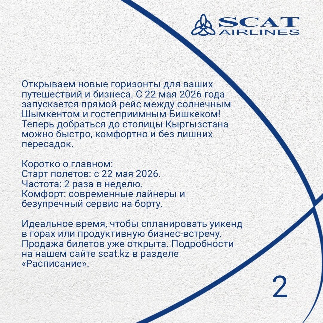 22 мамырдан бастап Шымкенттен Қырғызстан астанасы Бішкекке тікелей рейстер орындала бастайды. Заманауи лайнер аптасына 2 рет ұшады.