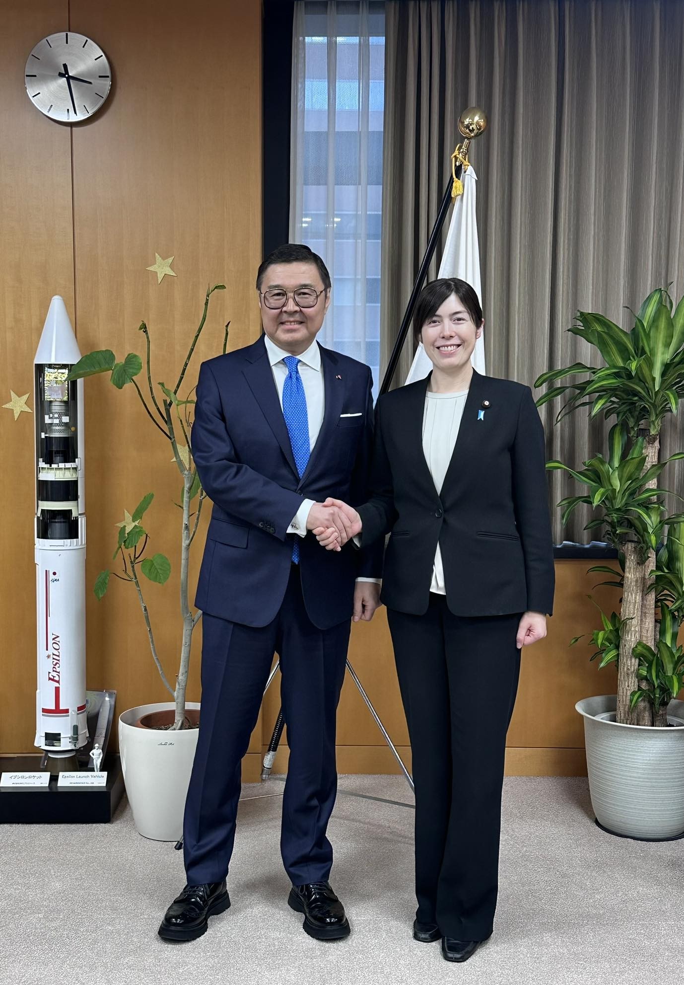 Токио, 2026 жылғы 10 сәуір – Қазақстан Республикасының Жапониядағы Елшісі Ерлан Баударбек-Қожатаев Жапонияның Экономикалық қауіпсіздік мәселелері жөніндегі министрі Кими Онодамен кездесу өткізді.