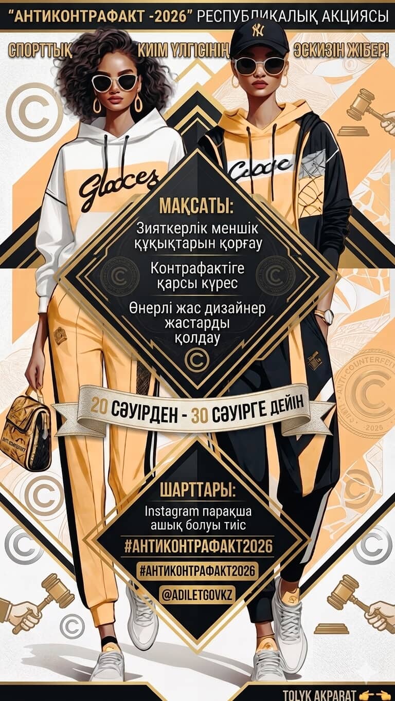 «Зияткерлік меншік және спорт: стартқа, назар, инновациялар» тақырыбындағы фитнеспен айналысуға арналған спорттық киім дизайны бойынша 10-11 (12) сынып оқушылары мен колледждердің 1-2 курс студенттері арасында республикалық конкурс өткізіледі.