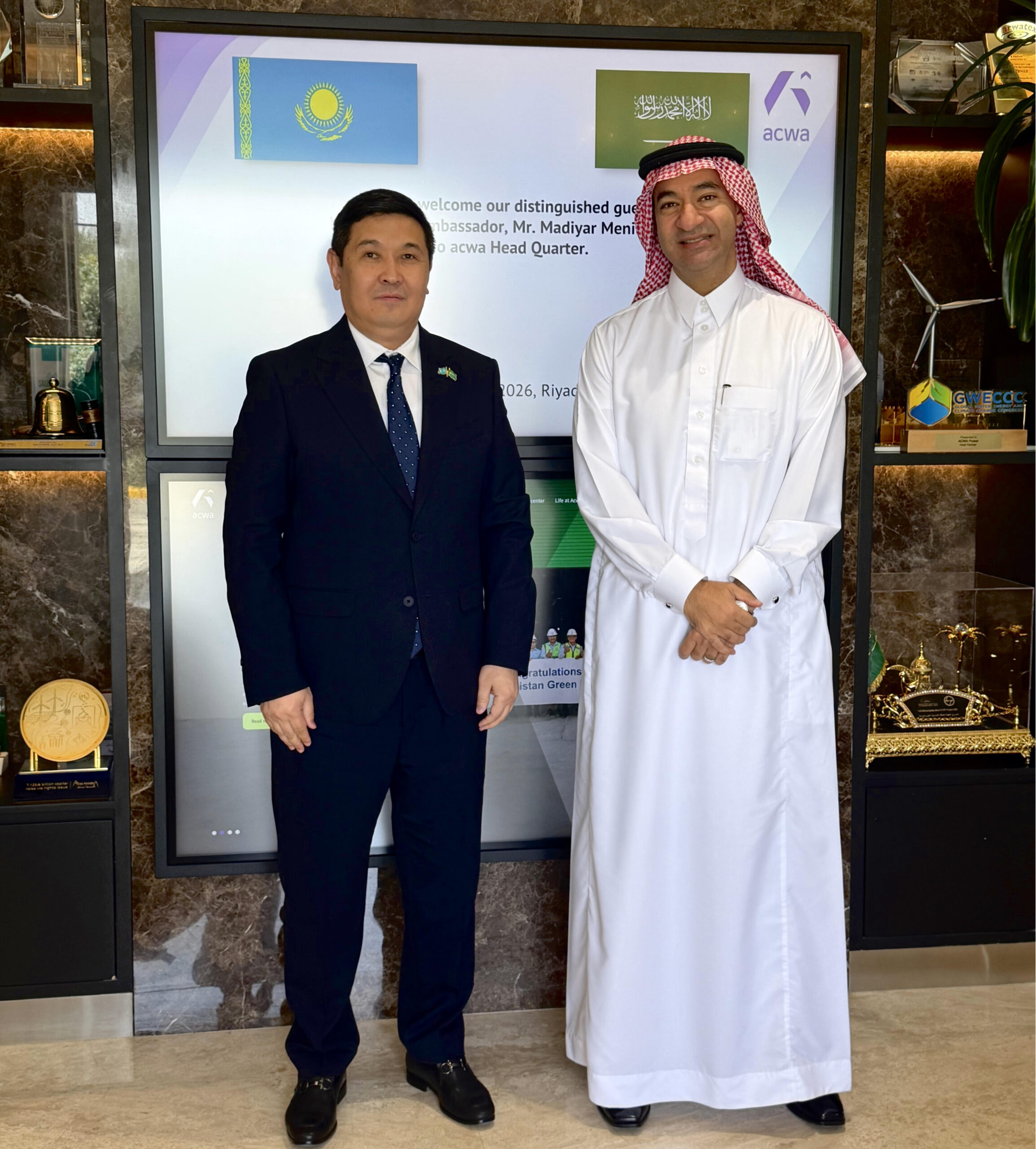 Рияд, 2026 жылғы 13 сәуір – Қазақстанның Сауд Арабиясындағы Елшісі Мадияр Меңілбеков «Acwa» компаниясы Төрағасының орынбасары және Басқарушы директоры Раад Әл-Саадимен келіссөздер жүргізді.