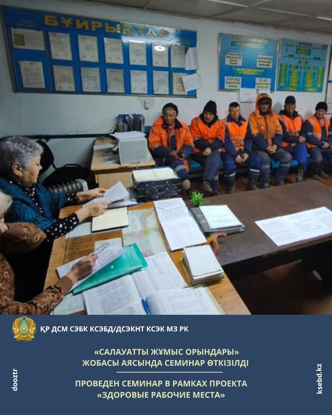 Жамбыл бөлімшелік көліктегі санитариялық-эпидемиологиялық бақылау басқармасы «Салауатты жұмыс орындары» жобасын іске асыру шеңберінде «ҚТЖ» ҰК» АҚ филиалы — «Магистральдық желінің Жамбыл бөлімшесі» «Шу жол дистанциясы» қызметкерлерімен семинар өткізді. Іс-шараның мақсаты — кәсіптік, инфекциялық және инфекциялық емес аурулардың алдын алу, қызметкерлердің денсаулығын нығайту және қауіпсіз еңбек жағдайларын қалыптастыру.